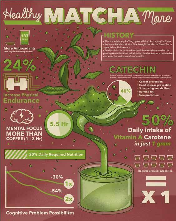 La siguiente infografía es de Quinn Ann Pham la cual se titula “Healthy matcha more” la cual maneja una armonía de color de un complementa rio directo y con formas orgánicas con base en vectores, por ejemplo en la imagen se aprecia una ilustración la cual da dinamismo y ritmo y representa el proceso del Te matcha, ya que primero se muestra las hojas de las matchas que pasan por un proceso hasta llegar a su consistencia de pulpa, por último en la parte inferior de la infografía hay una está la ilustración más grande de un frasco con la bebida final que es el té de matcha. Respecto a la tipografía se usa una familia de grotesca y manus crita, no se tiene claro las jerarquías de los textos y no hay una retícula, esto hace que los textos no estén alineados correctamente. Para el proyec to se tomará de referencia esta infografía, ya que posee un punto de partida que es el título, el cual destaca por la tipografía y el tamaño, después pasando por los subtítulos y textos destacados, dando una primera idea de lo que se encuentra en la infografía.