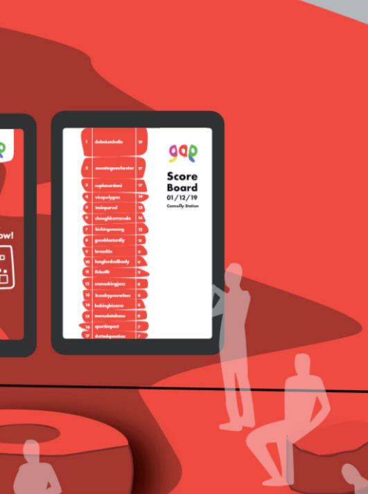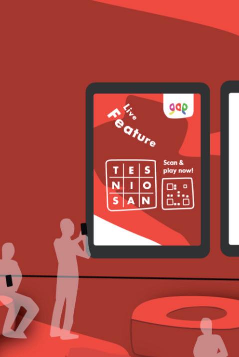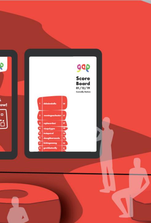 The concept is based on filling the emptiness and void that commuters can often encounter while waiting in the station or on train journeys. My research suggests that this is an issue for commuters that stifles joy. To counteract the emptiness and void of waiting, my idea is to create a waiting area in the station which will be split in three sections, live feature, pass time and puzzles. These sections will also correspond to the application’s functions. On the app the live feature will connect to a digital poster in the station, every day the poster will have different interactive activities, a game or a puzzle displayed, users can partake by scanning a code on the app and connecting with others at their station.