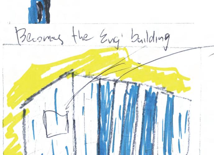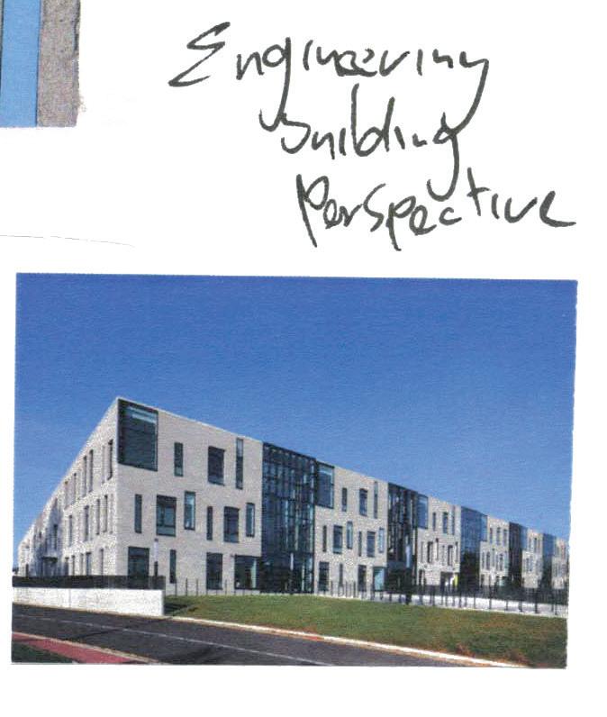 The setting, the AIT engineering building constructs in front of the character. I chose to use this as the setting as it has a distinguishable and identifiable look. The camera zooms into a window which takes the viewer inside the building into a corridor. Then here is shown some of the courses available, and some words and images related to the department sections to give a quick overview of what the department is all about. To make the this more understandable I split the department into two sections, engineering, and design.