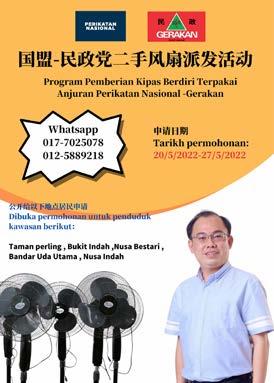 GERAKAN telah menganjurkan Program Pemberian Kipas Berdiri Terpakai yang berlangsung daripada 20 Mei 2022 hingga 27 Mei 2022 di kawasan Skudai. Tujuan program ini adalah untuk membantu mereka yang kekurangan bekalan kipas.