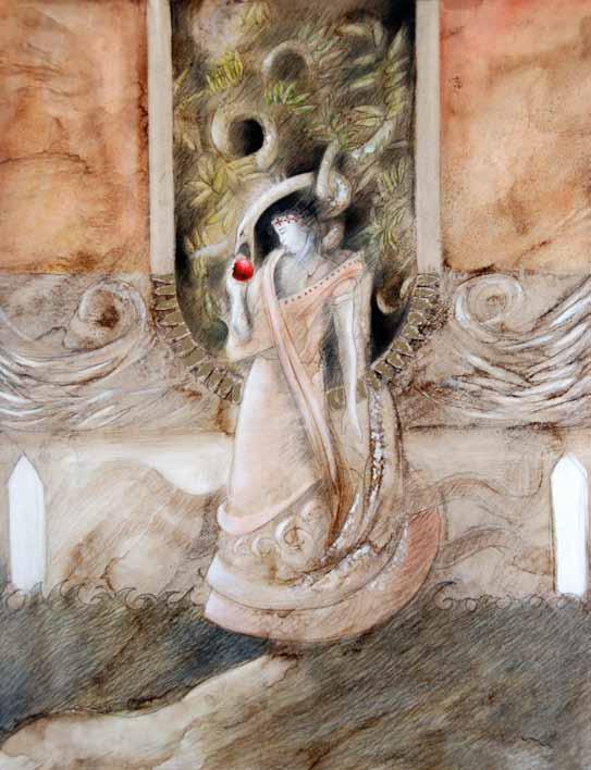 Bestiario y Magia. Otras de sus series memorables. La parca. Ni hombre ni mujer. Un rostro devenido en acertijo, misterioso, clausurado, inescrutable. Ella, la muerte, machihembrada por el tiempo. No causa espanto, solo es ÉlElla: maternidad compartida. Ruptura de todos los cánones sobre este tema. Acuna un cuerpo: su reciente presa. (¿Paris secuestrando a Helena, a su ánima?). Luce un vestido hindú. Y sobre la cabeza ramas, hojas, flores, frutos, sugerencias de vestigios heráldicos. La luz, como fugada de su propia energía, dimanando de su cuerpo. Una atmósfera cargada de presagios remotos se esparce por el cuadro.