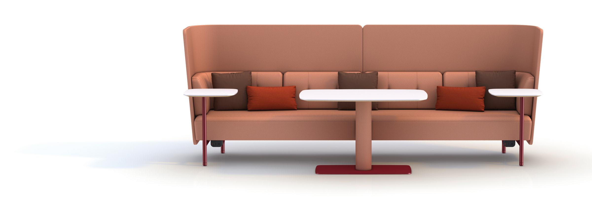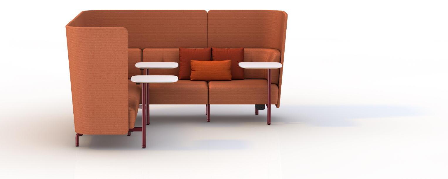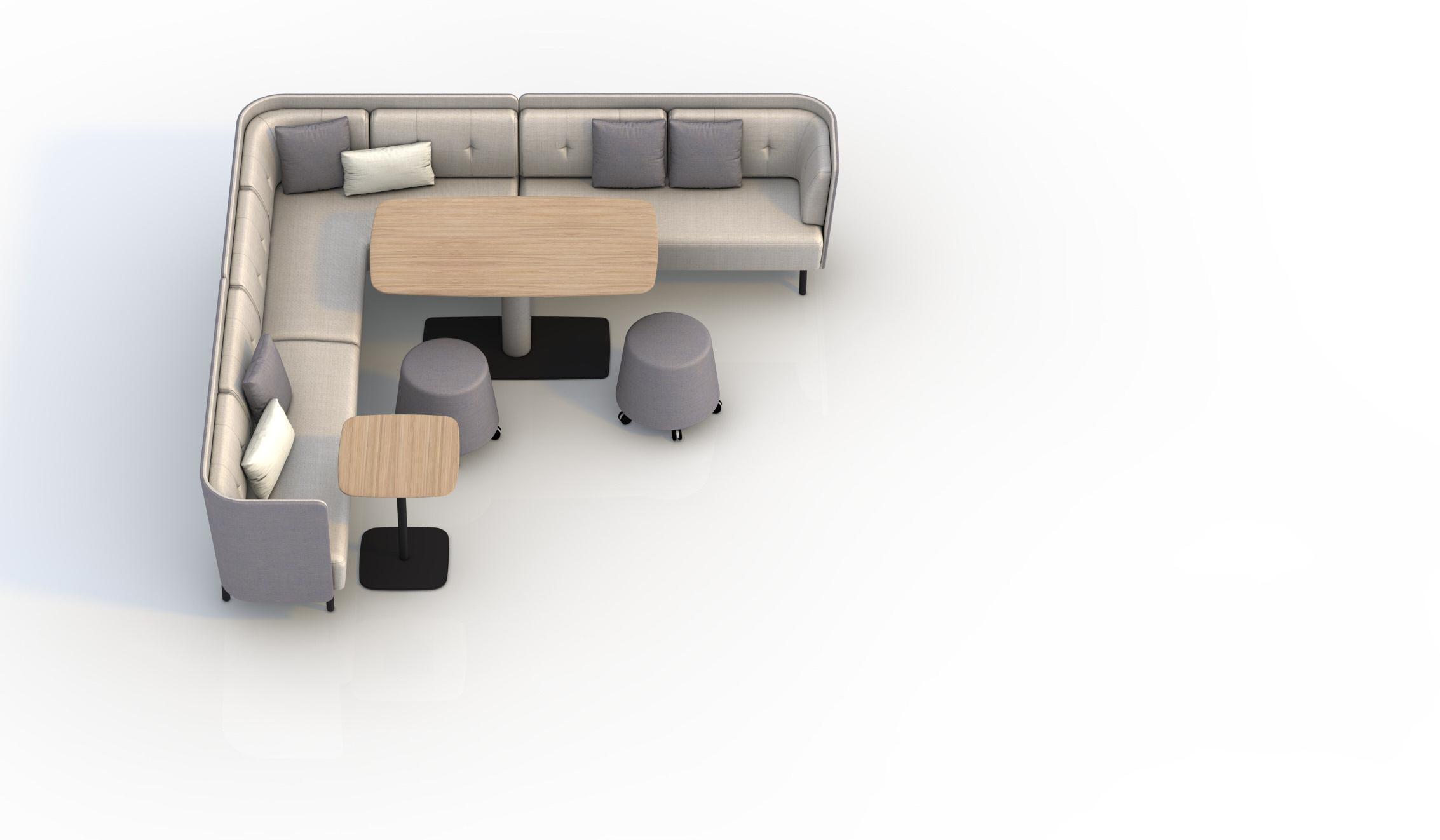 The metal frame of the upholstery units extends in front of the units to support a range of fixed worktop of varying sizes, together with an upholstered column option for larger tops. Which is further enhanced with a wide range of freestanding tables supported on structural tubes and heavy metal plate bases (to prevent movement). The tube legs of both the worktables and the upholstery units brings a clear architectural design value to the product.