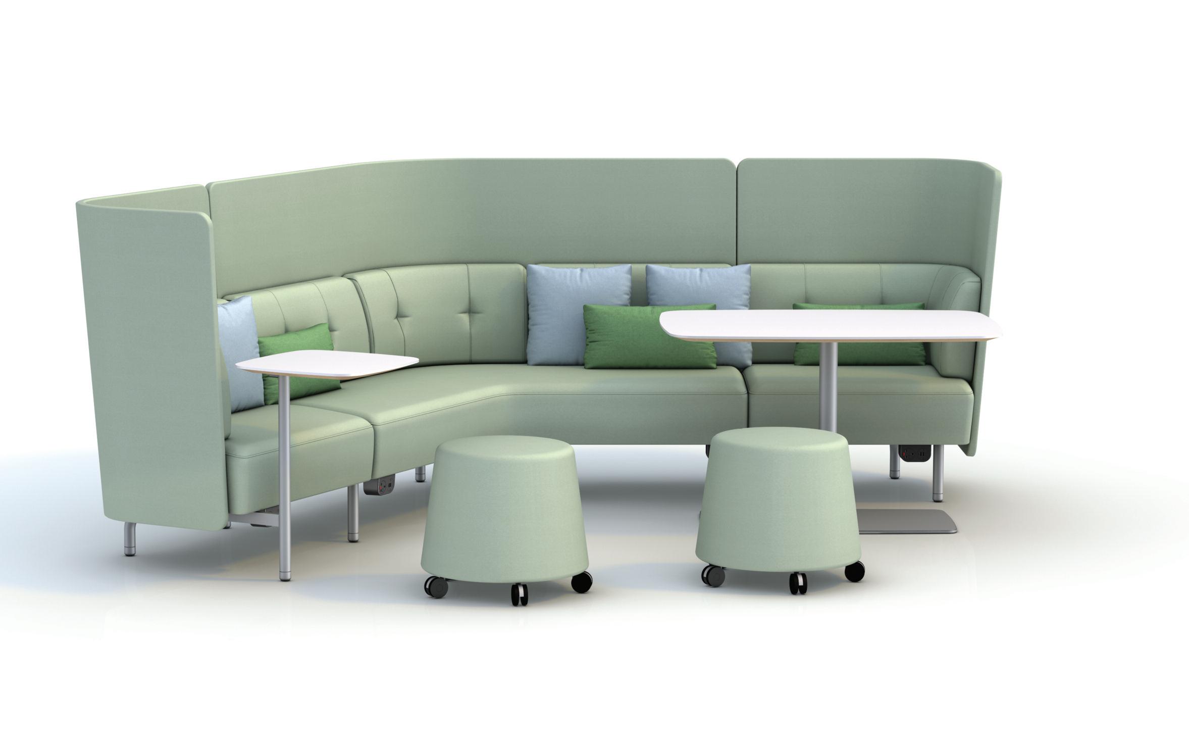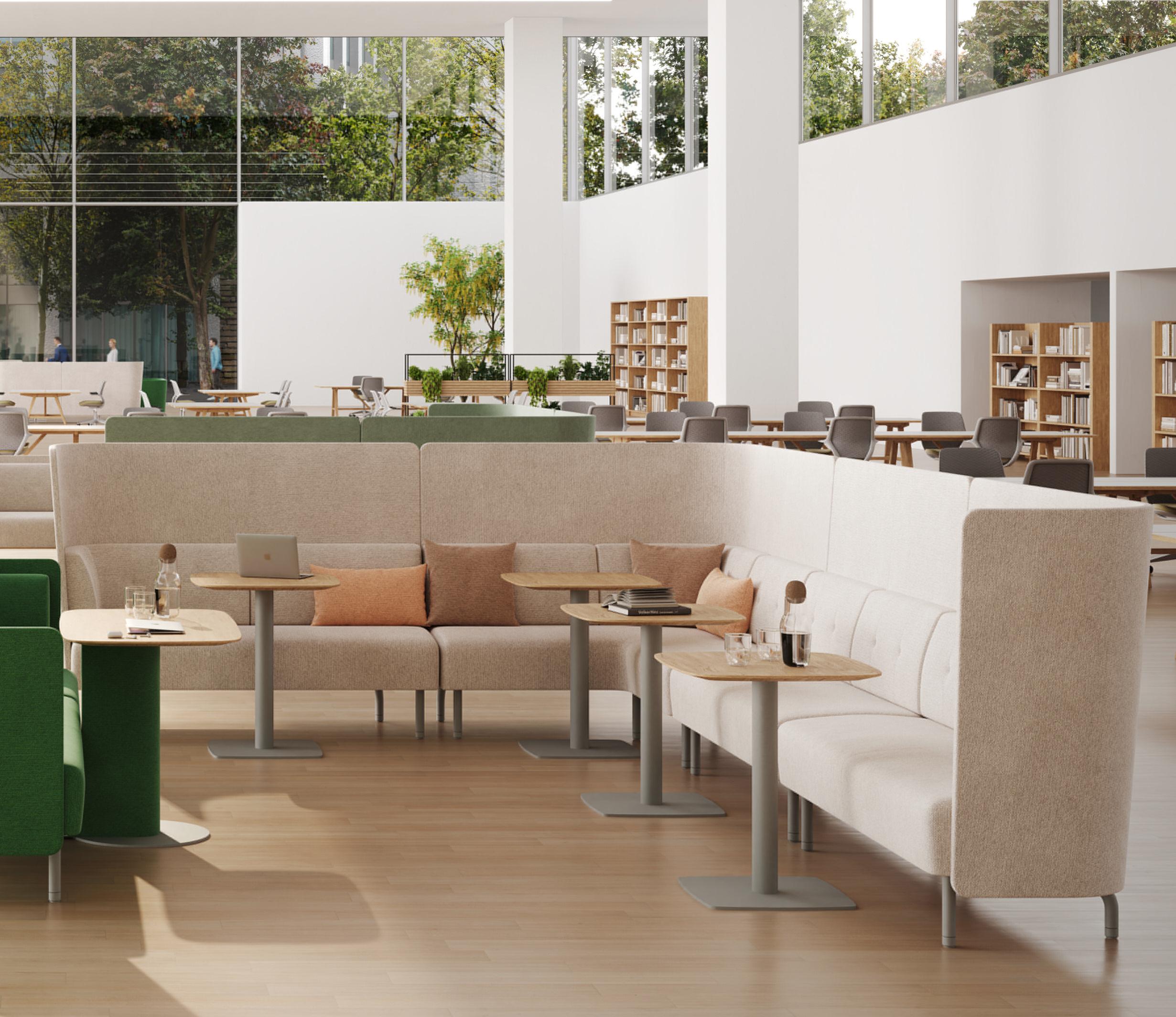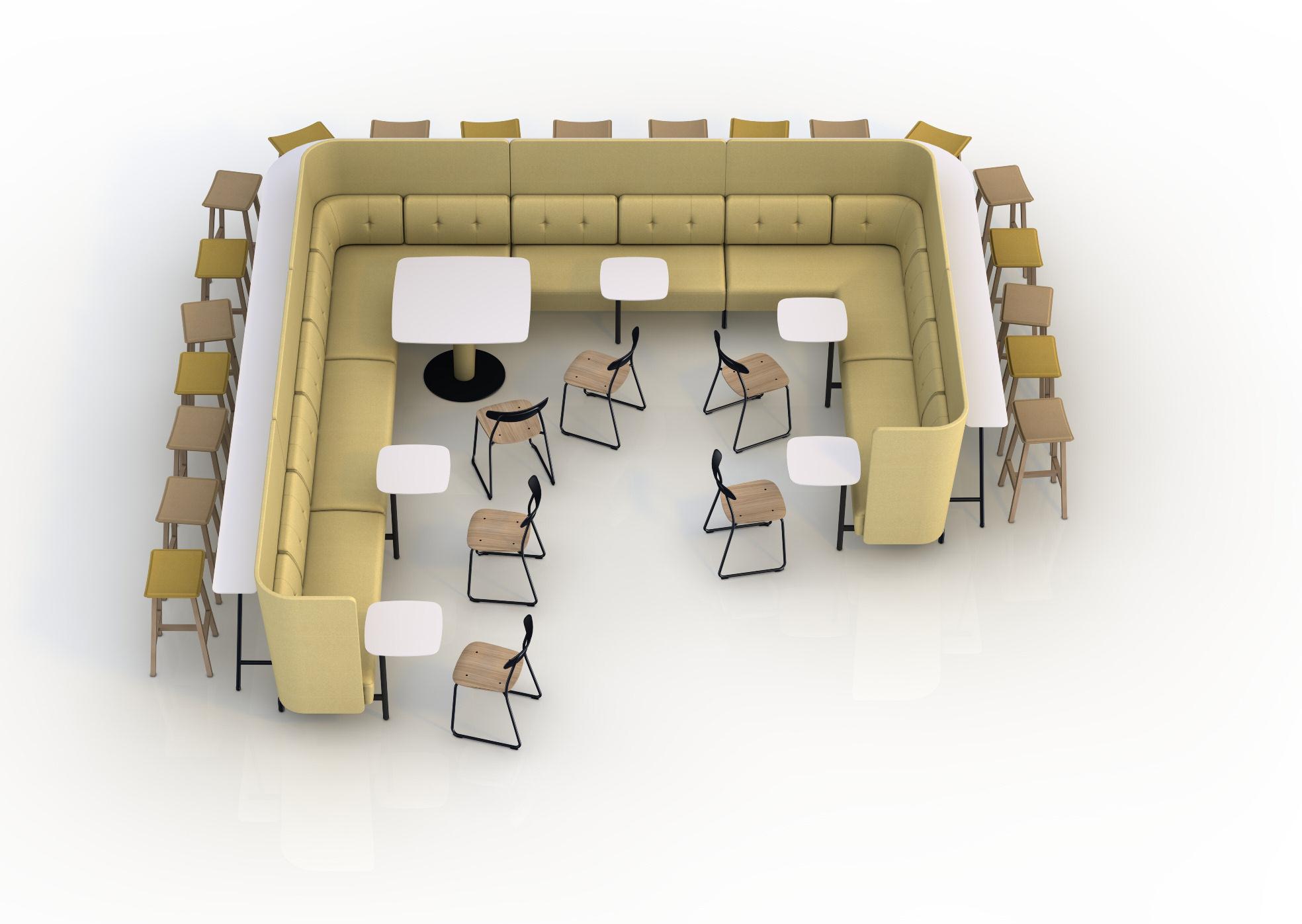 The metal frame of the upholstery units extends in front of the units to support a range of fixed worktop of varying sizes, together with an upholstered column option for larger tops. Which is further enhanced with a wide range of freestanding tables supported on structural tubes and heavy metal plate bases (to prevent movement). The tube legs of both the worktables and the upholstery units brings a clear architectural design value to the product.