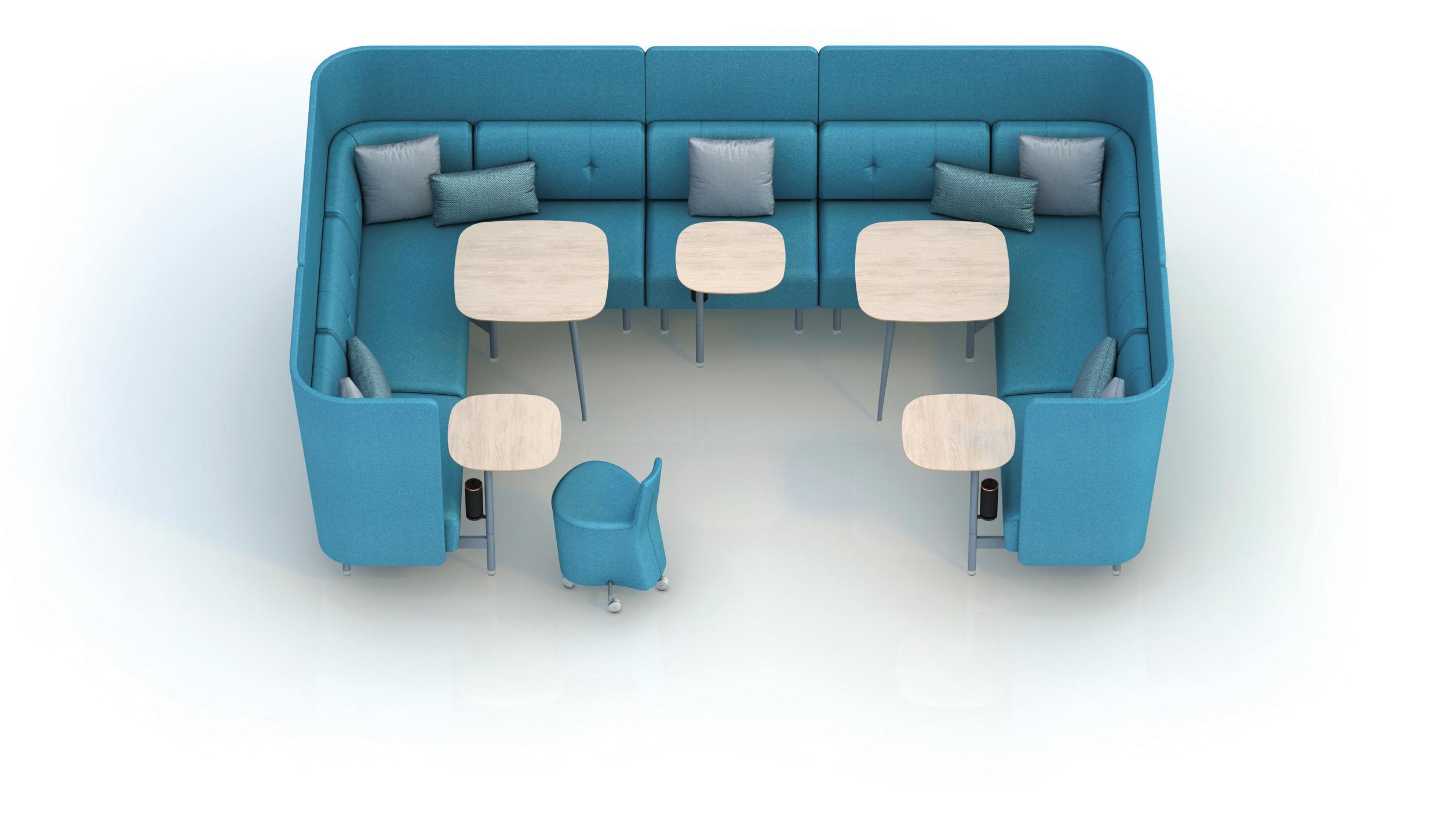 The upholstery design, colour and texture help to create effective, design rich space division and privacy through multiple configuration scenarios, from the individual to larger groups