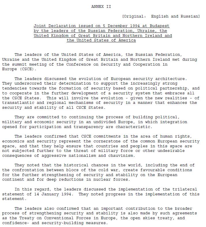 [47] Budapester Memorandum, welches Russland in den Besitz aller Atomwaffen und derer Vormaterialien brachte, die 1994 in der Ukraine, in Kasachstan und in Weiflrussland lagerten. Es wurde von Russland, der Ukraine, dem Vereinigten Kˆnigreich und den USA am 5.12.1994 unterzeichnet. (Siehe Seite VII.14). Am 19.12.1994 wurde es von den unterzeichnenden Staaten als Dokument des UNO-Sicherheitsrats und der UNO-Vollversammlung an alle UNO-Mitglieder verteilt und als internationaler Vertrag im UNO-Portal UNTERM erfasst. Sie garantierten die Souver‰nit‰t und territoriale Integrit‰t der Ukraine in den Grenzen von 1994. Sergey Lavrov unterzeichnete als UNO-Botschafter.