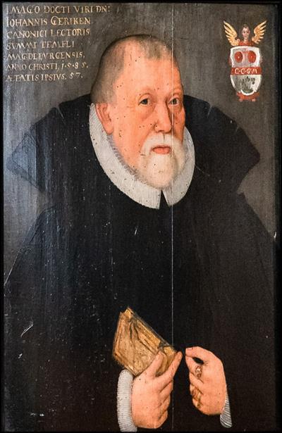 Wir danken dem Stifter, NICOLAUS III GERCKEN, † 1607, Domsyndikus in Magdeburg von 1594 bis 1607, und seiner Ehefrau MARGARETHA GERCKEN geb. BUSSE, † 1621, f¸r ihre Weitsicht und Groflz¸gigkeit. Ihr Konsumverzicht damals bildet unsere Basis heute.