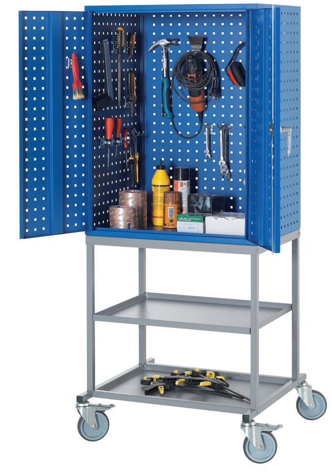 Flytta med verktygen när du jobbar. Verktygsvagn i perforerad stålplåt med två öppna hyllplan. Enkelsidig eller dubbelsidig öppning med cylinderlås. Fyra länkhjul där två är låsbara. Max belastning 75 kg