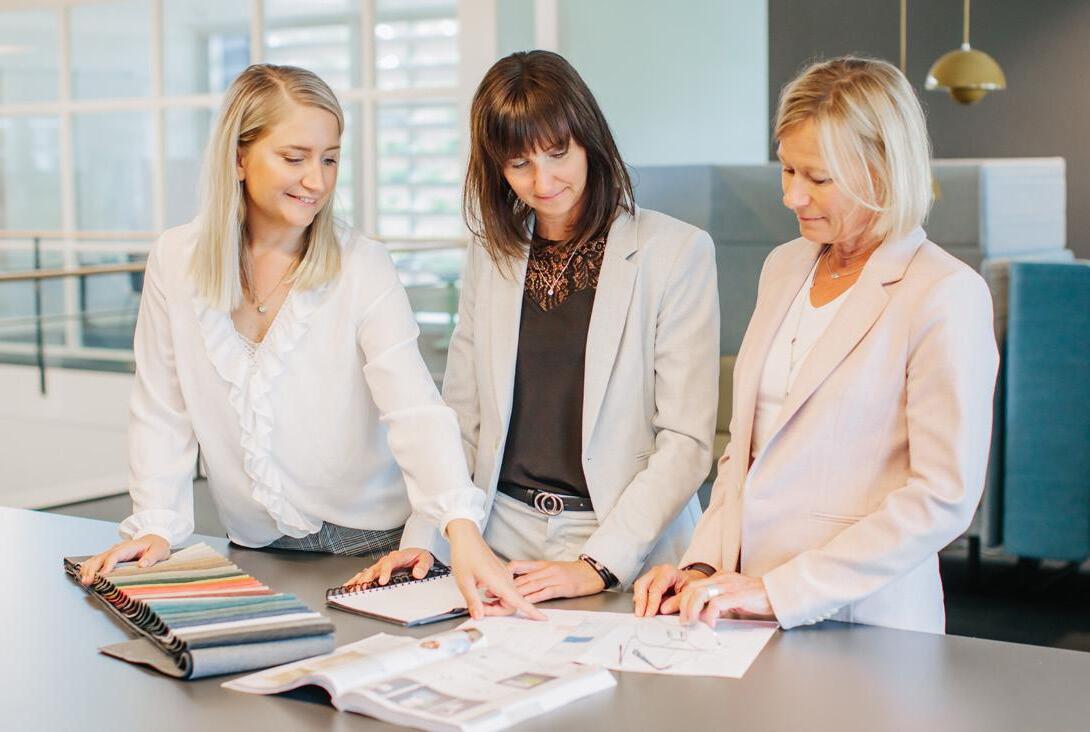 Visuella 3D- eller 2D-ritningar presenterar den färdiga interiören så nära verkligheten du kan komma. Arbetsplatsens och rummens planering, inredningens placering, färger, textilier, mattor, akustiklösningar – allt. Vi justerar förslaget, så att alla är helt nöjda.