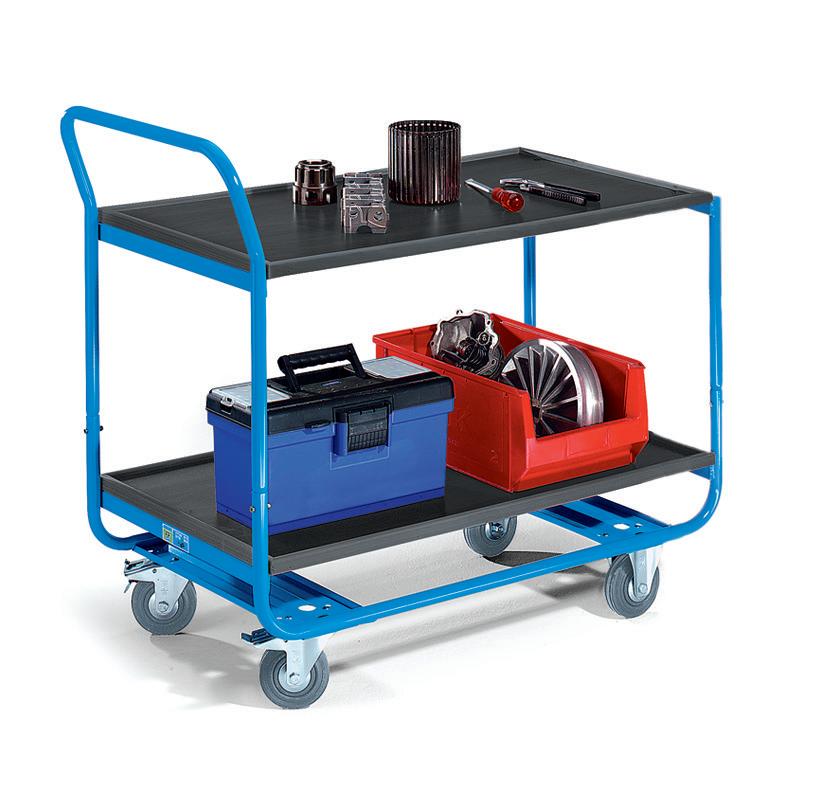 Vagn med bra lastyor i tålig MDF med kapacitet på 150 kilo. Enkel att ta sig runt med på lagret, vid tillverkning och montering. Två låsbara länkhjul och två fasta med rullager. Dubbelbroms. Lastyta 1000x570 mm, hyllplanshöjder 300/800 mm.