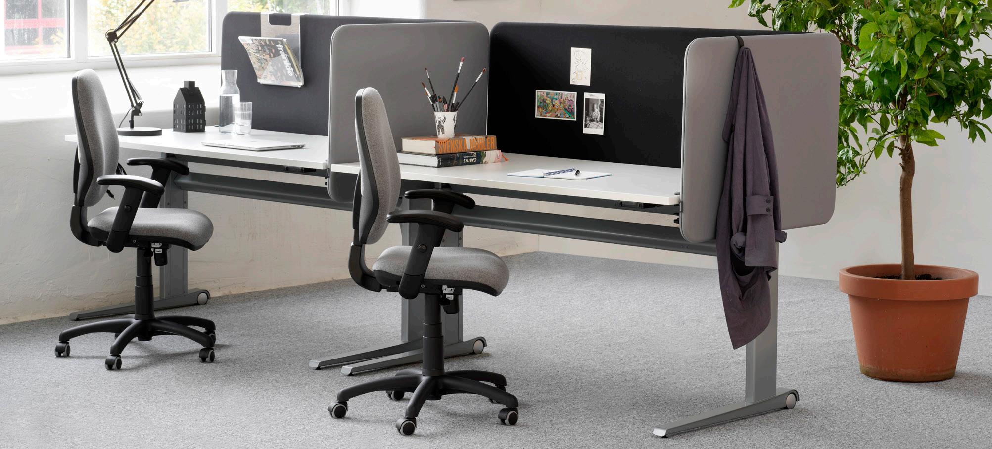 Bordsskärm standard är ett begränsat och optimerat urval av de mest sålda borsskärmarna. Skärmen finns i två utföranden, med runda alt. raka sidor och hörn för att passa just din smak och ditt kontor. Levereras i ett komplett paket där svarta bordsbeslag ingår. Skärmen består av ljudabsorberande fyllning som är monterad inuti en massiv träram. Beslagen fungerar på raka och fasade bordskanter (fasning upp till 20 mm) Finns i två färger, svart och grått.