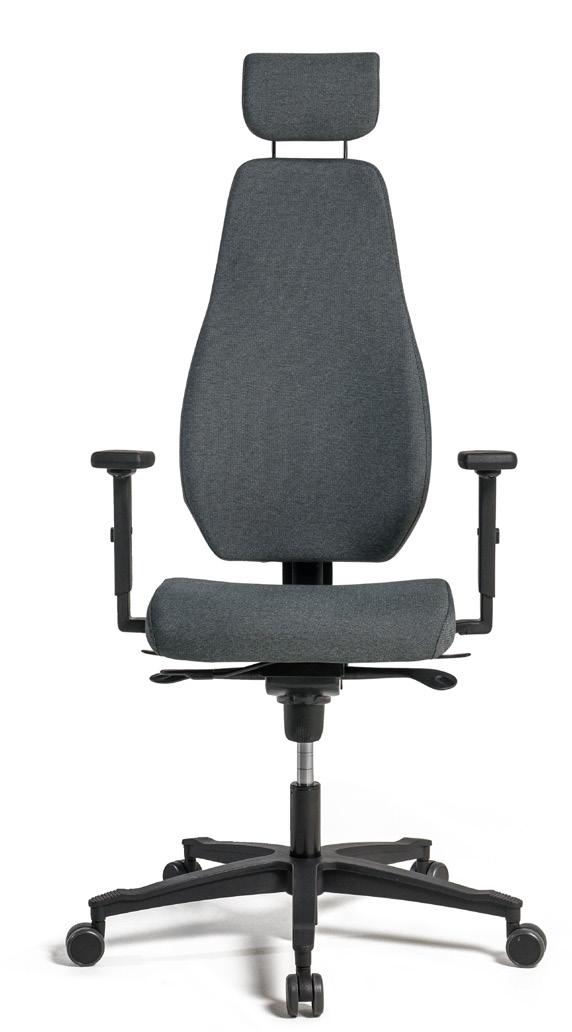 Bekväm kontorsstol med många inställningsmöjligheter. Justerbart nackstöd, svankstöd med pump. Sitsen är vinklingsbar framåt och är ställbar i djupet. Fotkryss av aluminium. Levereras med ställbara 4D armstöd samt hjul för hårda golv. Testad och godkänd enligt EN-1335.