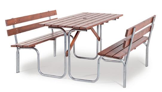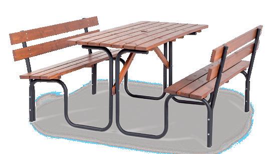 Tilava ja kestävä pöytä, johon on kiinnitetty penkit. Sinkitty teräsrakenne, jossa puiset lankut ruskeaa lakattua mäntyä. Toimitetaan osissa. Saatavilla eri värejä. Pöytä 1500x700 mm. 2 penkkiä selkänojalla, pituus 1500 mm. Kokonaisleveys 1850 mm.
