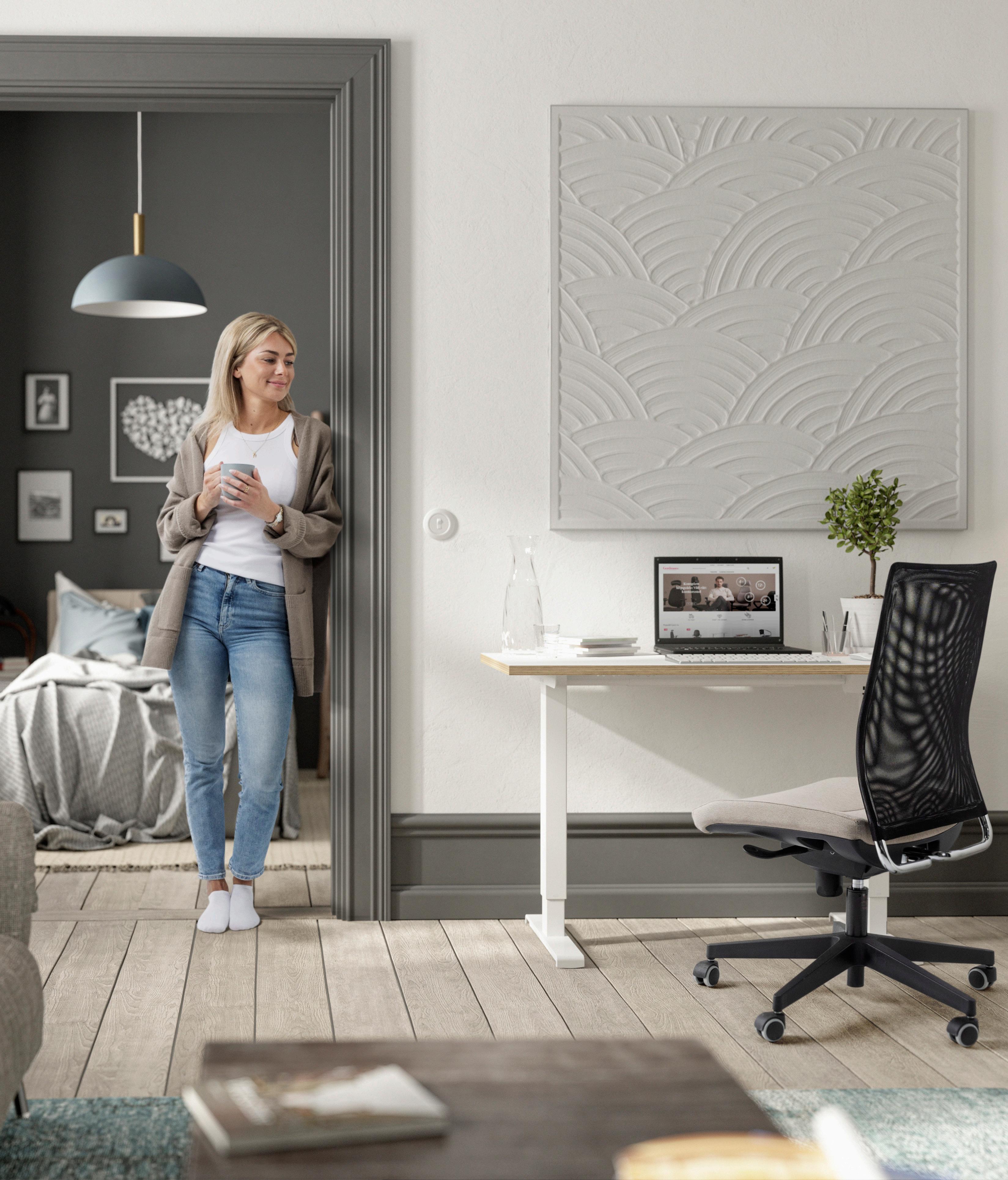 Vaihtele työasentoa! Lage on sähkösäädettävä työpöytä pienellä pöytälevyllä ja sopii kokonsa ansiosta hyvin kotitoimistoon. Korkeudensäätö ylösalas napilla 6801180 mm. Musta tai valkoinen sähkörunko, tummanharmaa tai valkoinen pöytälevy.