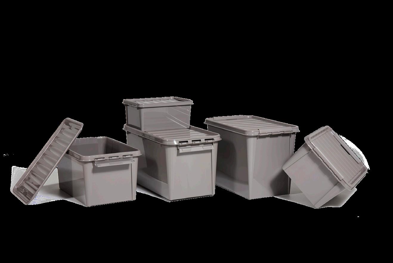 Plastkasse produsert av 100 % resirkulert plast. Leveres med lokk som settes fast med et enkelt håndgrep. Finnes i 5 ulike størrelser.