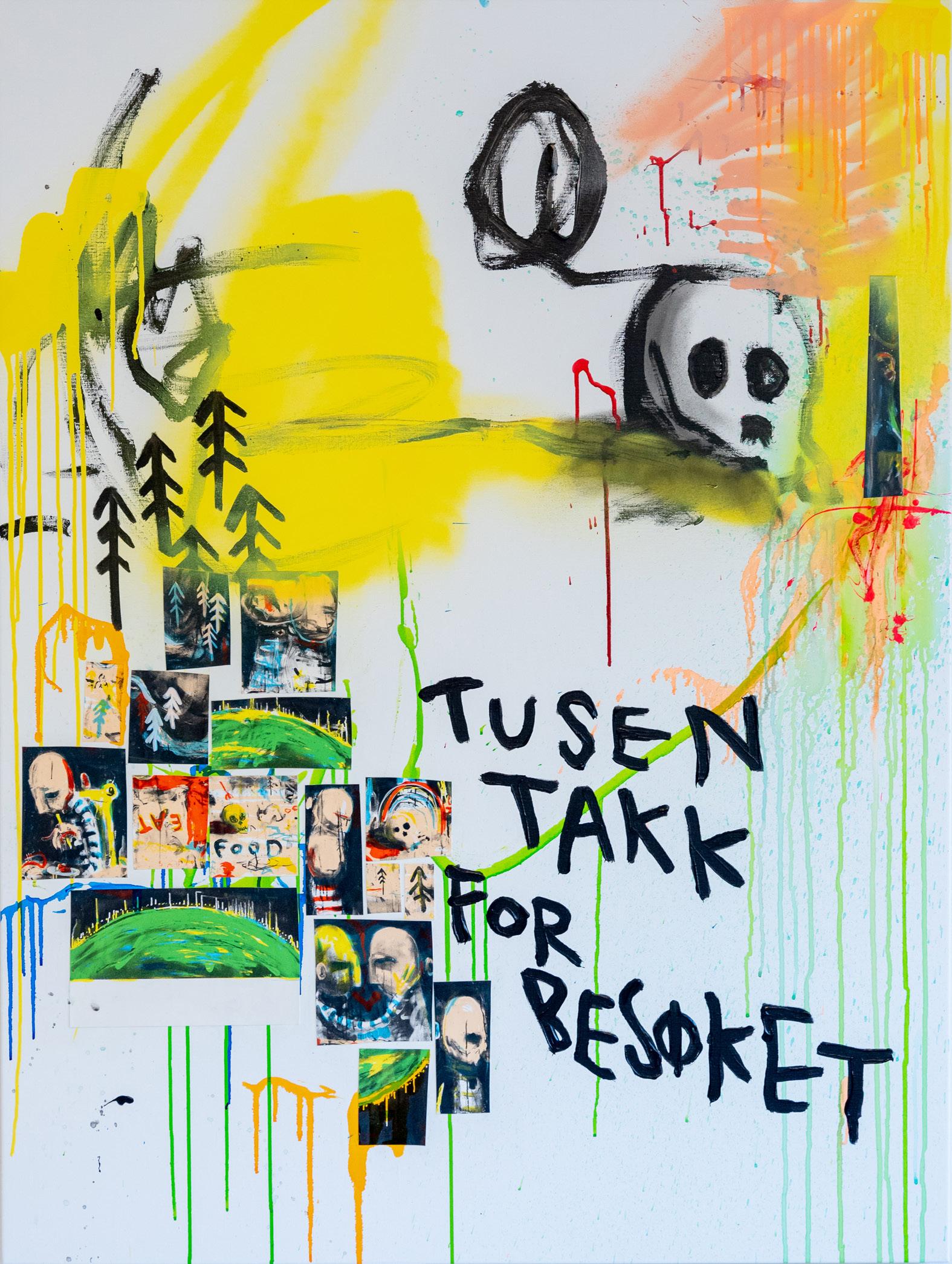 Takk for besøket 2022, 120x90 cm Serigraficollage og blandingsteknikk på linlerret