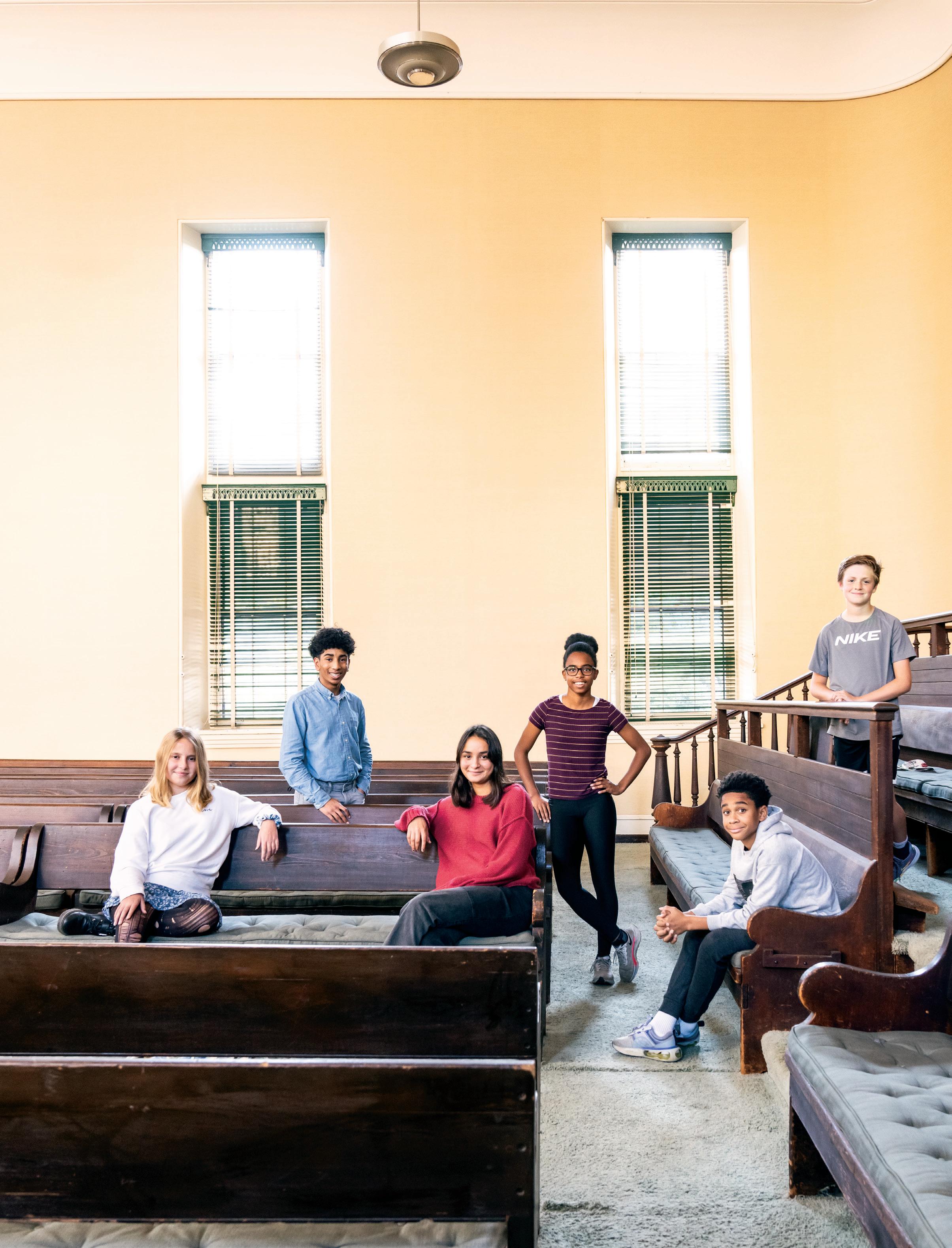 In the Meetinghouse, left to right: Tessa, Grayson, Laxmi, Madison, Taaj, Noah.