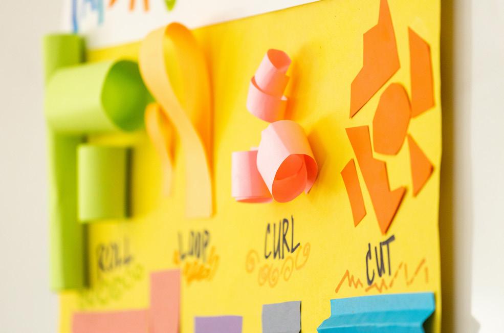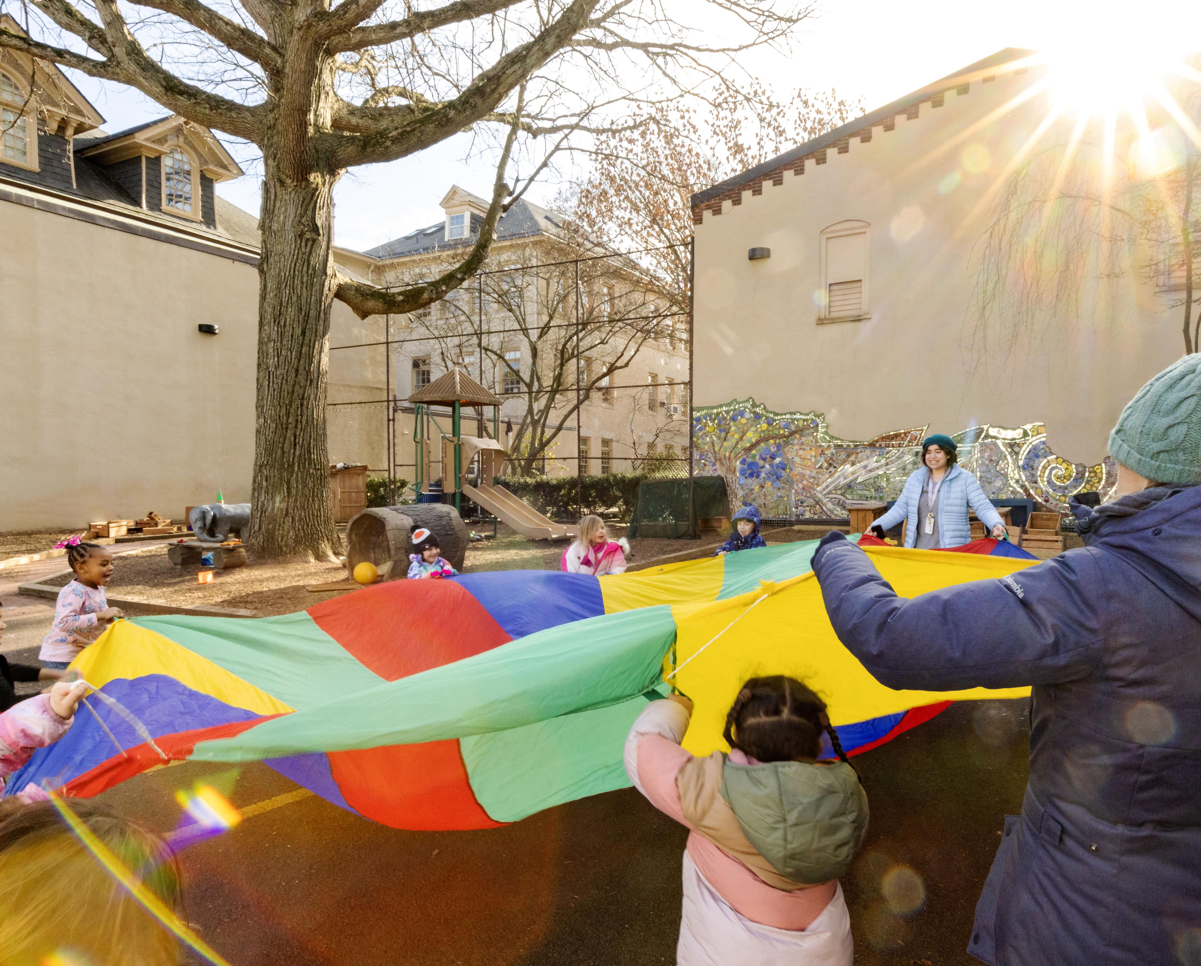 A large rainbow-colored parachute becomes a hot air balloon ride. Students pretend the route takes them on straight, curved, and zig-zagging pathways, which enhances their ability to make various shapes and kinds of motion. Corinne says, “I love working with this age group because their creativity is right at the surface. I hope that by celebrating that now, they’ll carry a love for movement throughout their lives.”