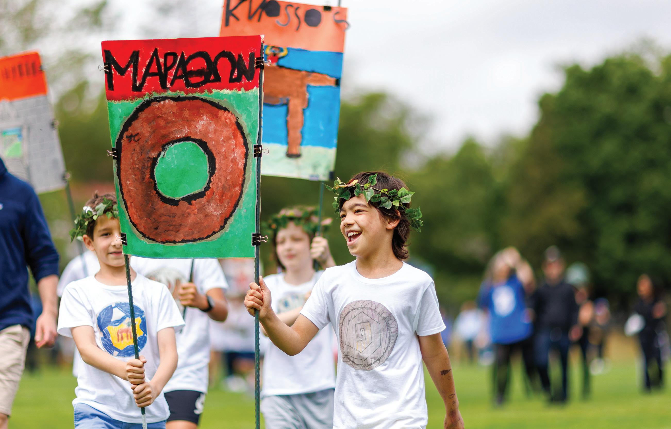 Sarah: The culmination is Olympics Day, which happens every spring and is one of GFS’ treasured Lower School traditions. The students design t-shirts with their own personal seal, which connects to our identity work. They learn about the events in P.E. class, then we hold a mini track meet complete with an opening ceremony, to remind them that the Olympics were a way to honor the gods, not just an athletic event. It’s fun to see them working together on the field—being competitive but also practicing good sportsmanship.