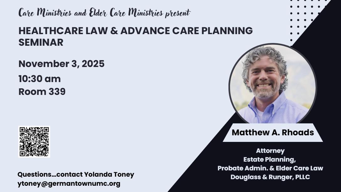 On Monday, November 3, Matthew Rhoads, Attorney specializing in estate planning, probate administration, and elder care law will be with us to talk about health care law and advance care planning.