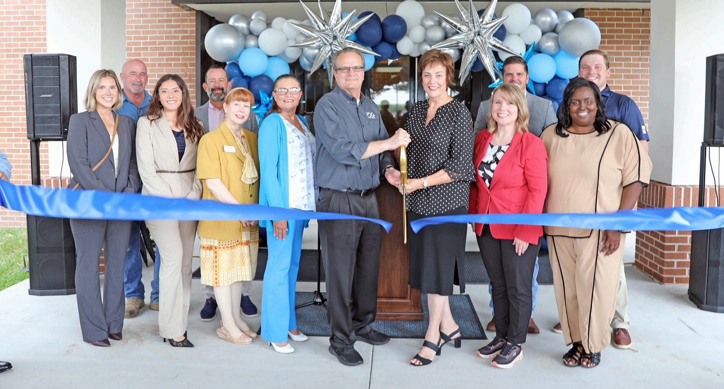 Dr Brian McCall, Chancellor of the Texas State University System, helps cut the ribbon for the TSUS Polk County Center in Livingston during a ribbon cutting celebration in August 2024 The day brought to fruition the collaborative work of LSCPA, Lamar State College Orange, and Lamar Institute of Technology officials as the Center seeks to serve Polk County residents with the opportunity for associate degrees, certificates and workforce training. LSCPA offers, among other programs, CDL and nursing training.