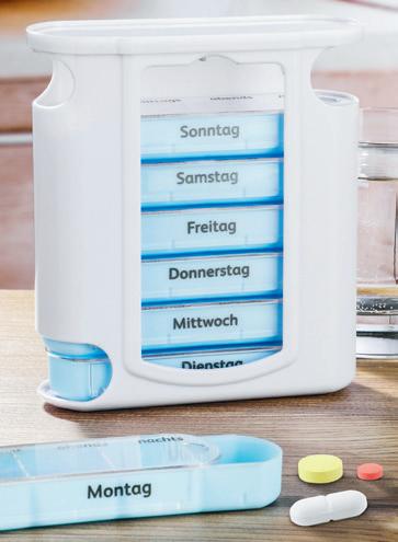 Tablettenbox Für 7 Tage. Jede Box mit Aufschrift „morgens/ mittags/abends/nachts“.