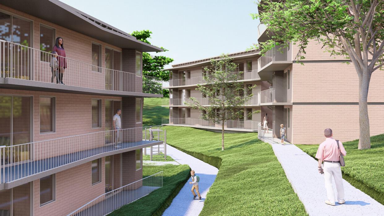 Se proponen dos volúmenes que se conectan mediante un punto fijo central, solamente unas pasarelas a modo de puentes, característicos del lugar, un patio divide los volúmenes convirtiéndose en espacio común para el usuario. Las diversas configuraciones de los vanos y balcones en fachada, modifican el espacio interior, es la búsqueda de la individualización constante, con una aparente contrariedad y diversidad.