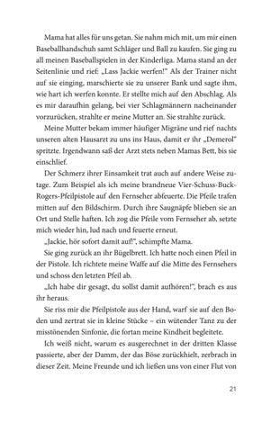 Mama hat alles für uns getan. Sie nahm mich mit, um mir einen Baseballhandschuh samt Schläger und Ball zu kaufen. Sie ging zu all meinen Baseballspielen in der Kinderliga. Mama stand an der Seitenlinie und rief: „Lass Jackie werfen!“ Als der Trainer nicht auf sie einging, marschierte sie zu unserer Bank und sagte ihm, wie hart ich werfen konnte. Er stellte mich auf den Abschlag. Als es mir daraufhin gelang, bei vier Schlagmännern nacheinander vorzurücken, strahlte er meine Mutter an. Sie strahlte zurück. Meine Mutter bekam immer häufiger Migräne und rief nachts unseren alten Hausarzt zu uns ins Haus, damit er ihr „Demerol“ spritzte. Irgendwann saß der Arzt stets neben Mamas Bett, bis sie einschlief. Der Schmerz ihrer Einsamkeit trat auch auf andere Weise zutage. Zum Beispiel als ich meine brandneue Vier-Schuss-BuckRogers-Pfeilpistole auf den Fernseher abfeuerte. Die Pfeile trafen mitten auf den Bildschirm. Durch ihre Saugnäpfe blieben sie an Ort und Stelle haften. Ich zog die Pfeile vom Fernseher ab, setzte mich wieder hin, lud nach und feuerte erneut. „Jackie, hör sofort damit auf!“, schimpfte Mama. Sie ging zurück an ihr Bügelbrett. Ich hatte noch einen Pfeil in der Pistole. Ich richtete meine Waffe auf die Mitte des Fernsehers und schoss den letzten Pfeil ab. „Ich habe dir gesagt, du sollst damit aufhören!“, brach es aus ihr heraus. Sie riss mir die Pfeilpistole aus der Hand, warf sie auf den Boden und zertrat sie in kleine Stücke – ein wütender Tanz zu der misstönenden Sinfonie, die fortan meine Kindheit begleitete. Ich weiß nicht, warum es ausgerechnet in der dritten Klasse passierte, aber der Damm, der das Böse zurückhielt, zerbrach in dieser Zeit. Meine Freunde und ich ließen uns von einer Flut von 21