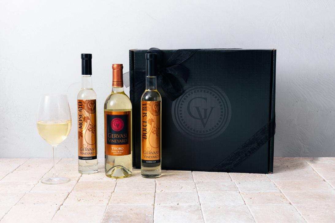 Includes three bottles of Gervasi’s Classic Sweet White Wine, Dolce Sera, Moscato, and Tesoro.