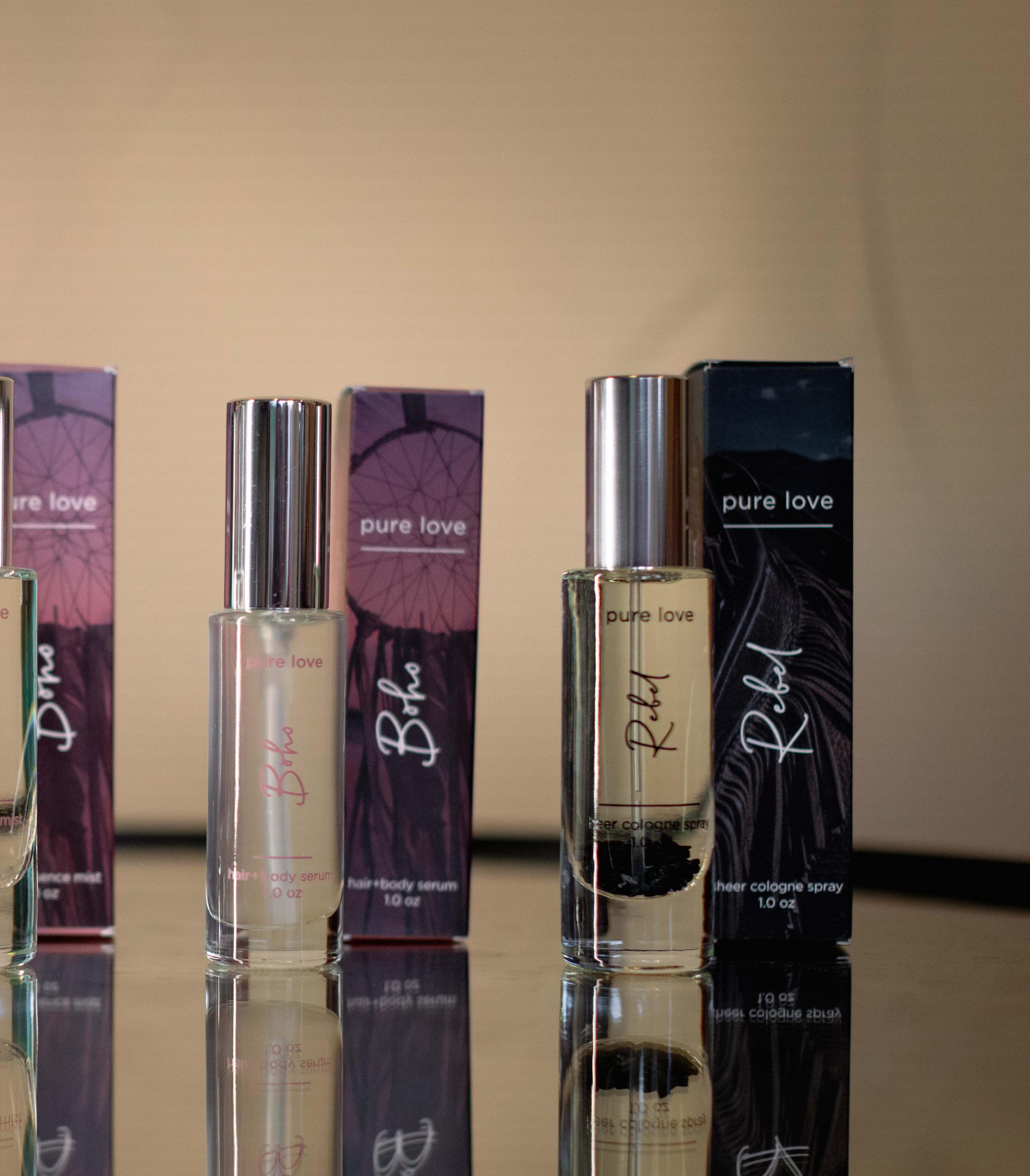 ABOVE: A. PURE LOVE ESSENCE MIST - SACRED (Purchase at Marketplace Only) B. PURE LOVE ESSENCE MIST - MOROCCAN (Purchase SERUM - BOHO (Purchase at Marketplace Only) E. PURE LOVE COLOGNE SPRAY - REBEL (Purchase at Marketplace Only)