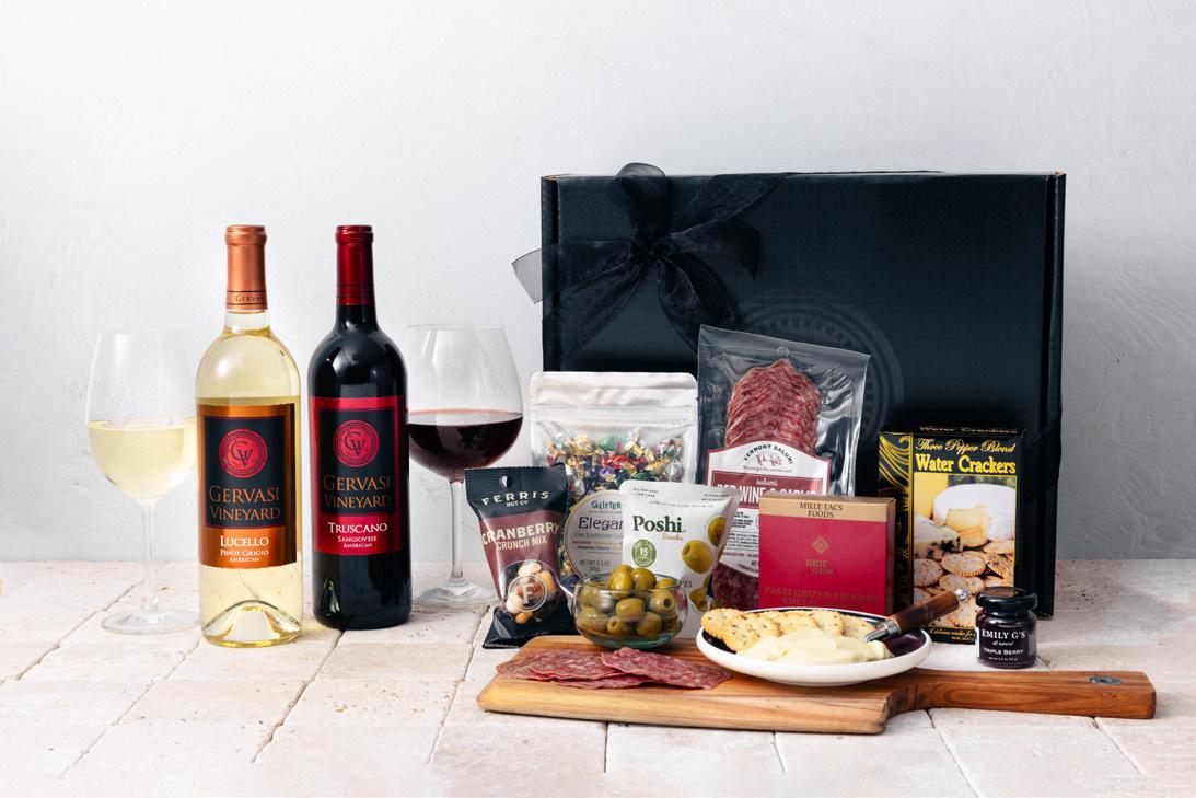 Includes two bottles of Gervasi Wine, Truscano and Lucello, with an assortment of crackers, cheese, salami, nuts, dried fruit, olives, candy, and Buoyant Gourmet Chocolate Bar.