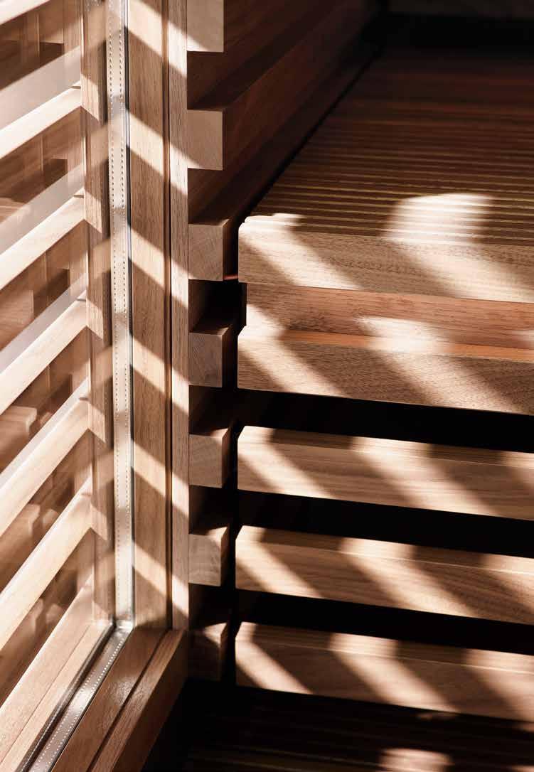 Het unieke, uitgesproken design van de sauna MATTEO THUN wordt nog extra geaccentueerd door de doordachte plaatsing van de houten balkjes. Een open design dat op virtuoze wijze met het binnenvallende licht speelt, maar eventuele blikken van buiten naar binnen doeltreffend weert. De leidende gedachte van onzichtbare techniek komt tot uiting in de discreet onder de zitbank geplaatste kachel. Het productdesign van Matteo Thun is herkenbaar aan de heldere lijnen en zijn voorliefde voor het werken met warme, natuurlijke materialen.