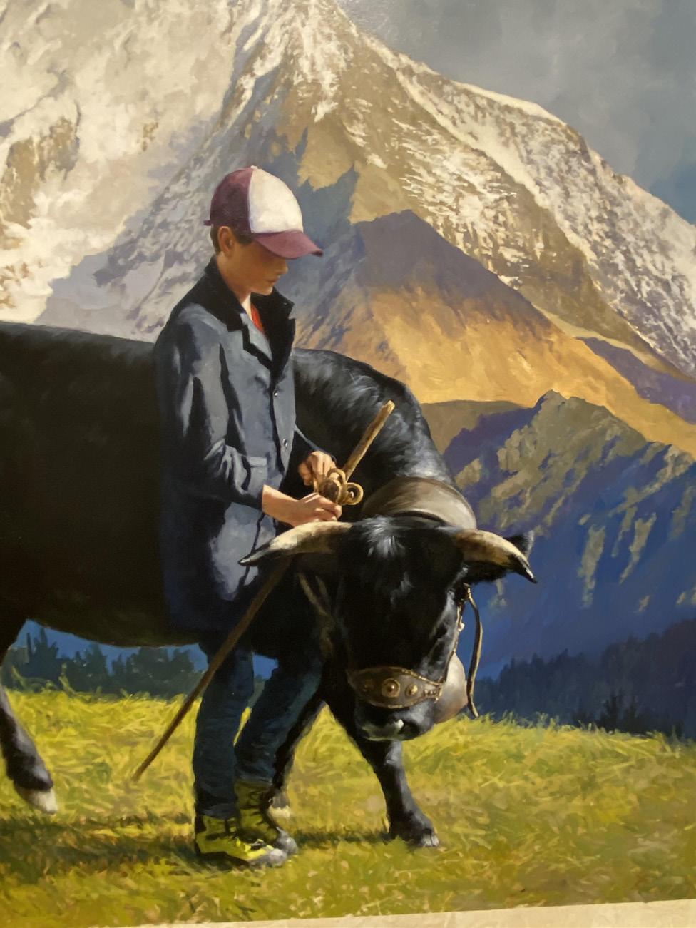 International examples of decorative painting, a broad category encompassing numerous techniques, were exhibited at the 2021 Salon, the 25th annual gathering of muralists, artisan painters and finish specialists held April 29 – May 2, 2021 at the St. Louis Artists Guild in Clayton, MO. Due to pandemic travel restrictions, many European and Asian professionals could not attend but many sent examples of their work on the theme of regionalism for a gallery exhibition. Their large hand-painted canvas panels were sent rolled up in mailing tubes and displayed unframed. French artist, Pascal Amblard, describes his approximately 5’ x 6’ panel as an oversized “study of a yet to come real painting. It shows a young cowboy of our area with the landscape I see from my studio. Most of what I paint, as a fine artist, could be labeled as Regionalism.”