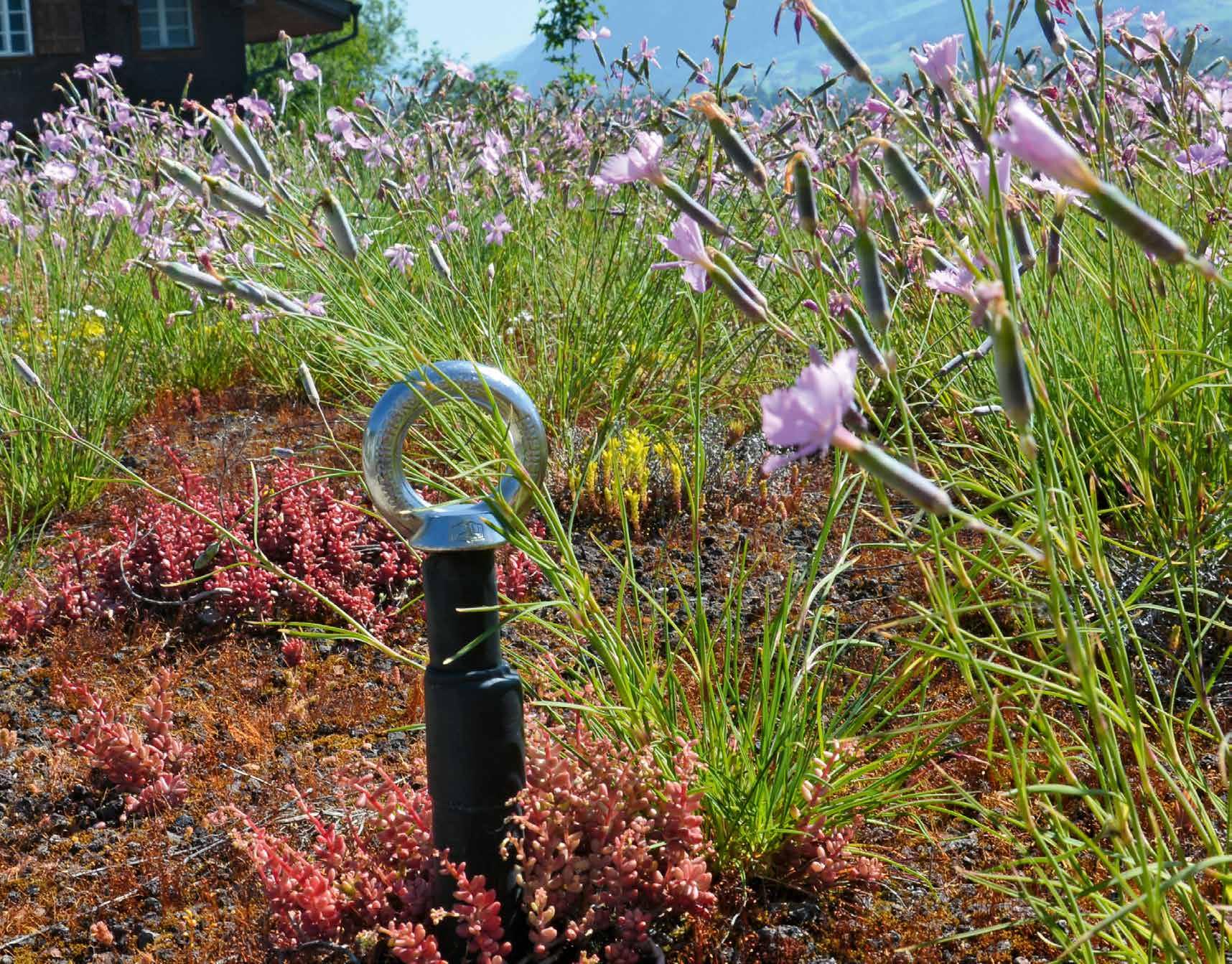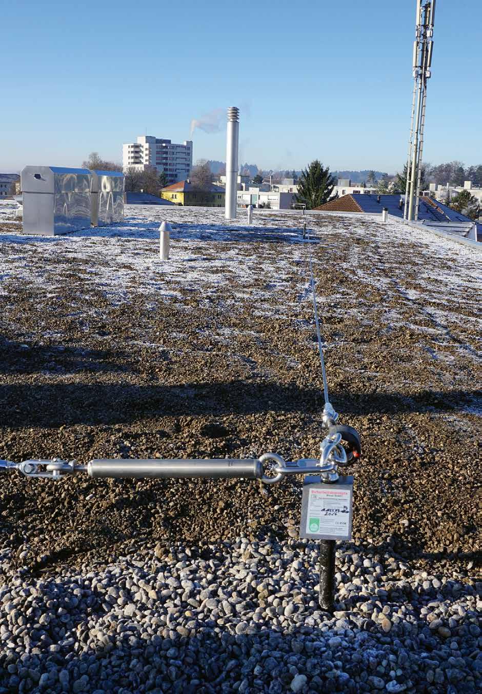 Zentrales Kriterium für die Wahl des idealen Absturzsicherungssystems sind die Nutzungskategorien und die Personengruppen� Um die in den Ecken des Dachs weiterhin bestehende Absturzgefahr so gering wie möglich zu halten, ist ein Abstand von 2,5 m zwischen Anschlageinrichtung und Absturzkante in den meisten Situationen ideal � Der maximale Zwischenabstand von Anschlageinrichtung zu Anschlageinrichtung darf i d R 7,5 m nicht übersteigen Bei grösseren Dachflächen bieten sich für besseren Anwenderkomfort durch permanente Wechsel der einzelnen Anschlagpunkte somit ein überfahrbares Seilsystem an Um in schneereichen Gebieten eine sichere Schneeräumung auf Dächern zu gewährleisten, ist ein grösserer Abstand zwischen Seilsystem und Absturzkante zu wählen: ein Auffangsystem kombiniert mit Einzelanschlagpunkten