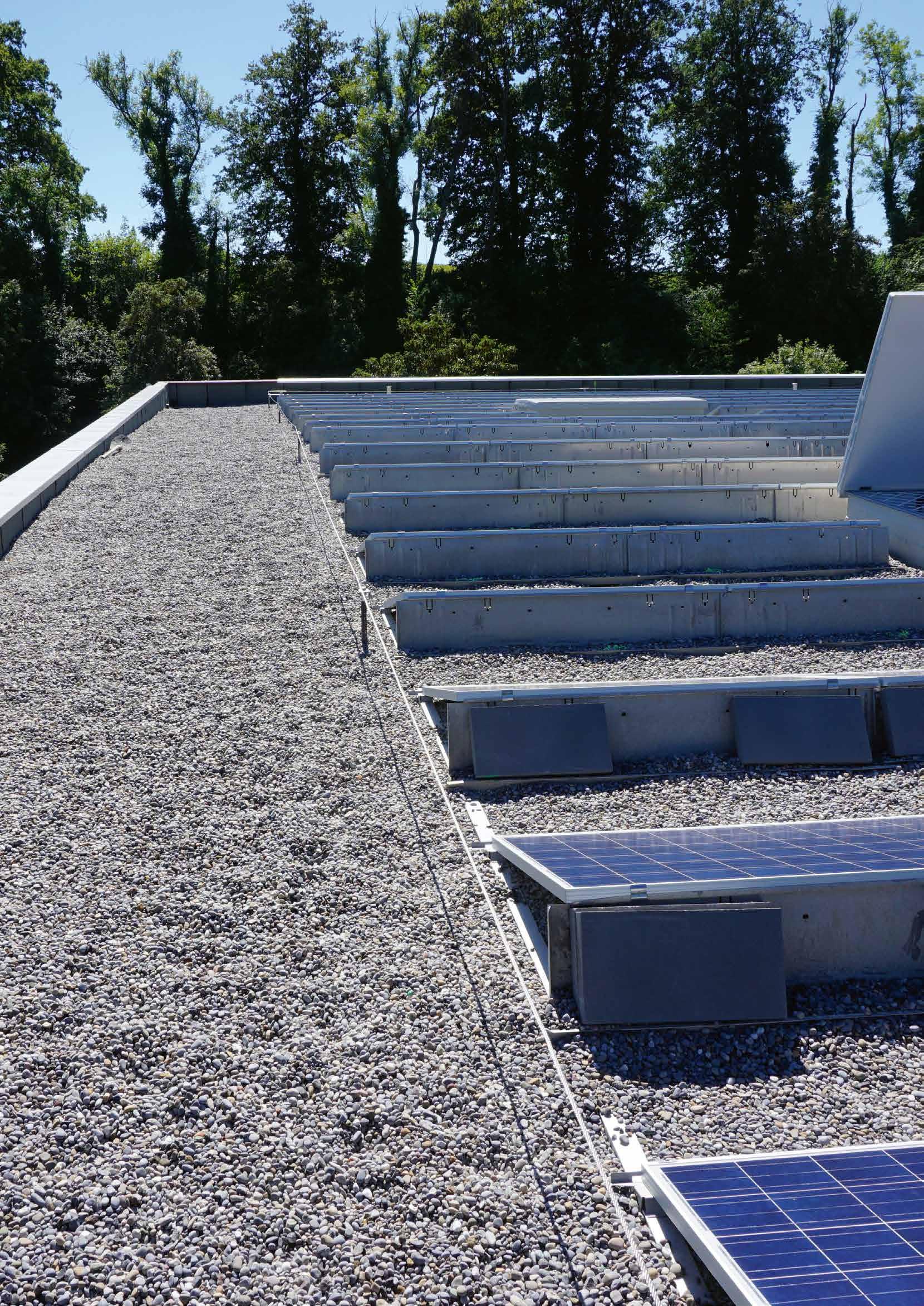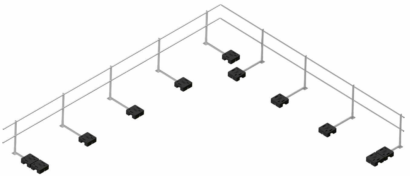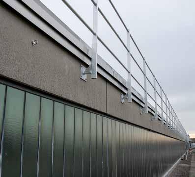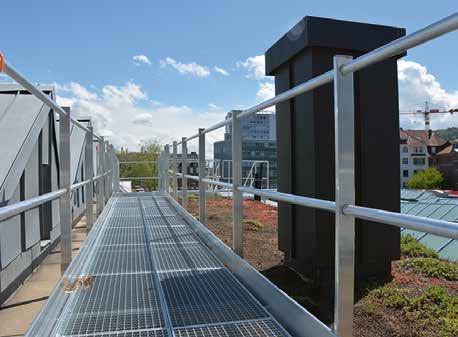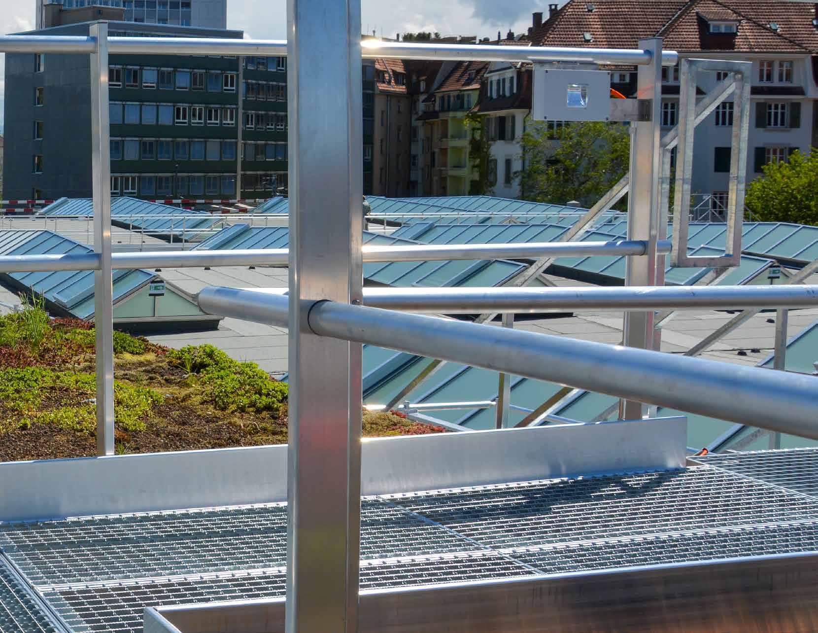 Der Kollektivschutz ist eine technische Massnahme, die Personen, unabhängig ihrer Ausrüstung oder ihres Verhaltens, schützt Die Benutzer gelangen nicht bis zur Absturzkante, sie sind geschützt durch beispielsweise Geländer, Seitenschutz oder Gerüst � Dieses System eignet sich für häufige Dachbegehungen bei Installationen mit intensiver Wartung
