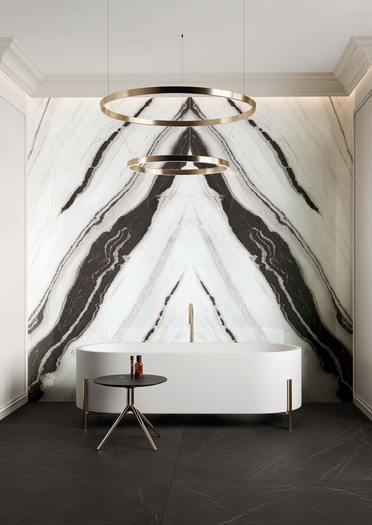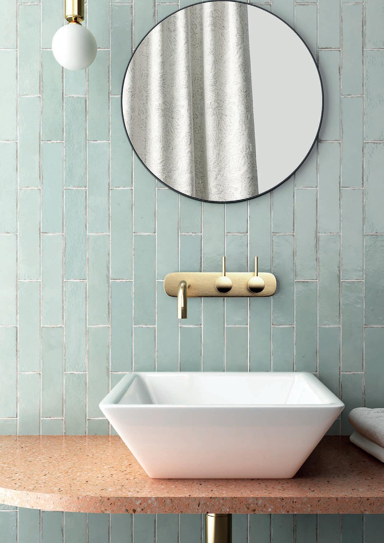 Frische Farben – beispielsweise in verschiedenen Grünund Blautönen – sind im Trend und lassen klassische KeramikPlatten aufleben. Schimmernde FeinsteinzeugPlatten in Beton oder MetallOptik zaubern einen Hauch von Eleganz und Individualität in Ihre Räume. Ob dezent, puristisch oder stilvoll – neue Interpretationen von traditionellen Dekoren erzielen eindrucksvolle Effekte.