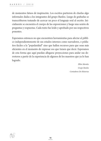 de momentos fatuos de inspiración. Los escritos partieron de charlas algo informales dadas a los integrantes del grupo Bardos. Luego de grabarlas se transcribieron tratando de acercar un poco el lenguaje oral al escrito. Inicialmente se encuentra el cuerpo de las exposiciones y luego una sesión de preguntas y respuestas. Cada texto fue leído y aprobado por sus respectivos ponentes. Esperamos entonces no que encuentren herramientas para afectar al público independientemente de sus estados internos como narradores, o peldaños fáciles a la “popularidad” sino que hallen recursos para que sean más eficientes en el momento de expresar eso que tienen que decir. Esperamos de esta forma que aquí puedan allegarse proyecciones para andar sus derroteros a partir de la experiencia de algunos de los maestros que ya lo han logrado. Elkin Morales Grupo Bardos Contadores De Historias