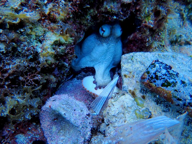 Look for: green sea turtles grazing on seagrass, eagle rays, and colorful reef fish near the rocks.