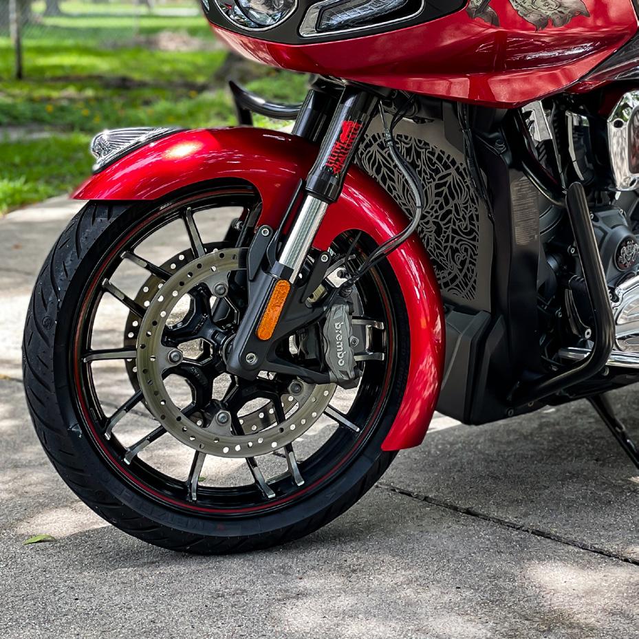 If you’d like to step away from a traditional “full coverage” fender style, take a look at our Tire Hugger Series Front Fender options. Designed to hug your tire closely and let you show off your wheel, these direct bolton replacement fenders will dramatically change the look of your bike.