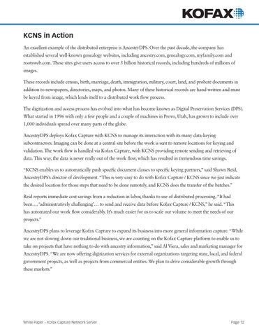 KCNS in Action An excellent example of the distributed enterprise is AncestryDPS. Over the past decade, the company has established several well-known genealogy websites, including ancestry.com, genealogy.com, myfamily.com and rootsweb.com. These sites give users access to over 5 billion historical records, including hundreds of millions of images. These records include census, birth, marriage, death, immigration, military, court, land, and probate documents in addition to newspapers, directories, maps, and photos. Many of these historical records are hand written and must be keyed from image, which lends itself to a distributed work flow process. The digitization and access process has evolved into what has become known as Digital Preservation Services (DPS). What started in 1996 with only a few people and a couple of machines in Provo, Utah, has grown to include over 1,000 individuals spread over many parts of the globe. AncestryDPS deploys Kofax Capture with KCNS to manage its interaction with its many data-keying subcontractors. Imaging can be done at a central site before the work is sent to remote locations for keying and validation. The work flow is handled via Kofax Capture, with KCNS providing remote sending and retrieving of data. This way, the data is never really out of the work flow, which has resulted in tremendous time savings. “KCNS enables us to automatically push specific document classes to specific keying partners,” said Shawn Reid, AncestryDPS’s director of development. “This is very easy to do with Kofax Capture / KCNS since we just indicate the desired location for those steps that need to be done remotely, and KCNS does the transfer of the batches.” Reid reports immediate cost savings from a reduction in labor, thanks to use of distributed processing. “It had been…. ‘administratively challenging’… to send and receive data before Kofax Capture / KCNS,” he said. “This has automated our work flow considerably. It’s much easier for us to scale our volume to meet the needs of our projects.” AncestryDPS plans to leverage Kofax Capture to expand its business into more general information capture. “While we are not slowing down our traditional business, we are counting on the Kofax Capture platform to enable us to take on projects that have nothing to do with ancestry information,” said Al Viera, sales and marketing manager for AncestryDPS. “We are now offering digitization services for external organizations targeting state, local, and federal government projects, as well as projects from commercial entities. We plan to drive considerable growth through these markets.”