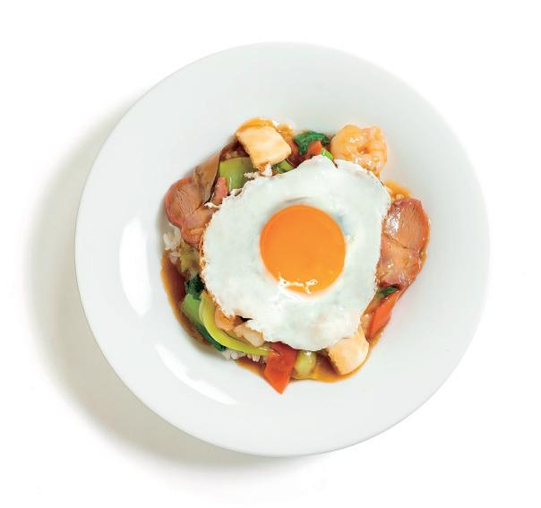 五目具材の上に乗せた目玉焼きの黄身と醤油 仕立ての中華あんが御飯に絡まります。。