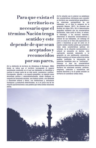 (5) En relación con lo anterior se establecen dos características intrínsecas para concebir un territorio sus características geográ cas y las relaciones sociopolíticas de sus habitantes, en el libro la venganza de la geografía (Kaplan, 2017). Se presenta que durante los siglos XIX y XX el determinismo geográ co mantenía que las características territoriales, tales como el clima, el relieve, la hidrología, o los recursos naturales, determinan el desarrollo socioeconómico y cultural de sus habitantes, sin embargo tal como se avoca en el libro esta explicación es pobre e inconclusa ya que tal como en el nuestro existen muchos países que presentan todas estas características optimas sin embargo, no su situación socioeconómica y cultural se encuentra en declive, esta explicación asociada netamente a la geografía es una justi cación colonialista, donde la pobreza y el atraso cultural de ciertos pueblos justi caba la intervención de potencias mundiales para su “civilización”. Entonces si bien las características geográ cas son factores determinantes en un territorio las relaciones sociales, políticas, religiosas, culturales y económicas son factores decisivos y no se puede concebir un territorio sin considerar ambas ideas.