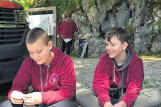 Die Sekundaris der Quantinum sind im Lager, die Primaris haben sturmfrei. Hm, wer weiss, vielleicht ist es ja auch umgekehrt. Auf jeden Fall freuen sich gross und klein über die Abwechslung im Schulalltag. Wenn nur Petrus da oben das auch so sehen würde. Zwei, drei wärmere, sonnige Tage würden die Abwechslung dieser Woche vervollständigen. Man kann nicht alles haben, also stapfen wir im regensicheren Zwiebellook durchs kühle Tobel, am rauschenden Bach vorbei. Hatte der obere Wasserfall jemals so viel Wasser? Wir stehen am Rossbach und bewunderten sein Tosen. Faszinierend, wie schnell Hölzchen und Blätter um die Kurve schiessen. Im warmen Atelier warten schon die gewaschenen «Bollen-Steine» bis sie bemalt werden. Magerquark, heisses Wasser und ein Spezialsalz braucht’s für die farblose Kaseinmasse. Kleine Portionen vermischen wir mit Pigmenten. Bald schon kann’s los gehen. – Zwischenzeitlich, die Farben müs-
