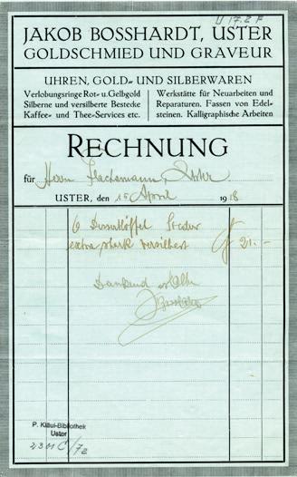 Rechnung vom 15.4.1918 über 21 Franken für 6 Dessertlöffel.