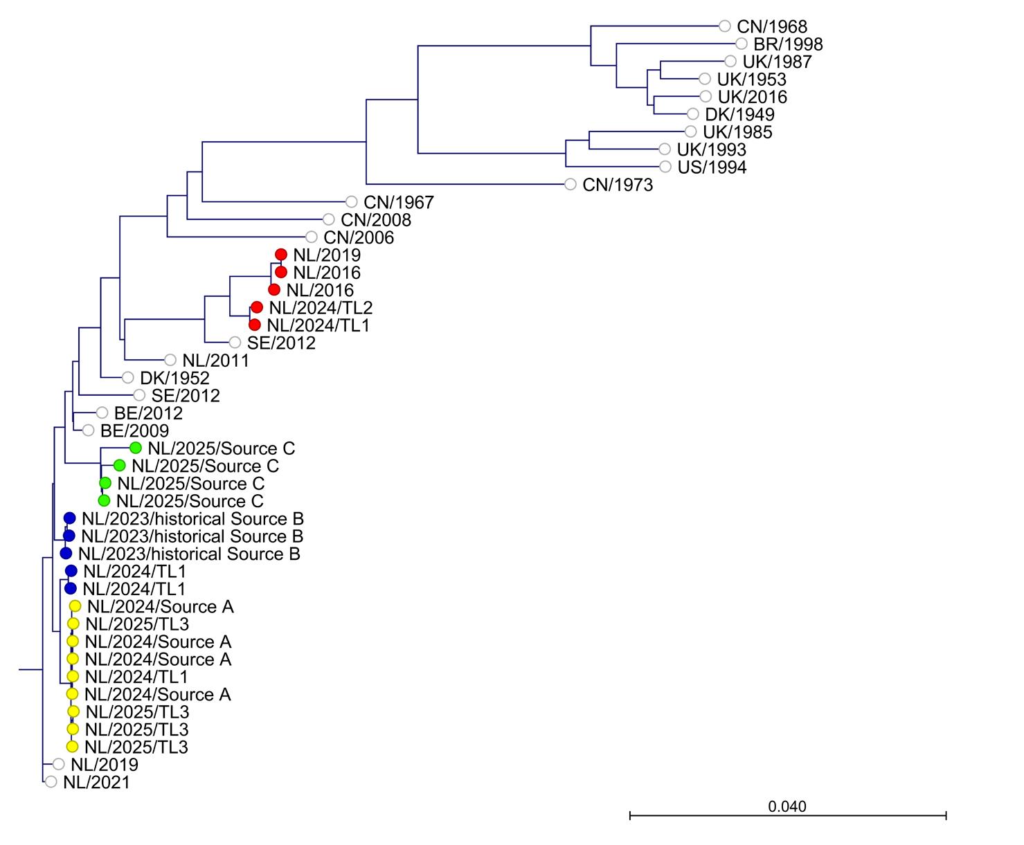 In 2024 and 2025, GD received a total of three submissions for necropsy from a specialist shop for the non-commercial poultry sector, involving various breeds and origins. GD showed that Salmonella Pullorum (SP) was present. GD conducted genetic testing of the SP strains identified. The results are given in Figure 5; the three submissions are labelled TL1, TL2 and TL3. They originated from breeding flocks and hatcheries (designated as sources A, B and C) of non-commercial poultry that were sampled and found to be positive for SP. The genetic relationships between the Salmonella Pullorum isolates found in non-commercial poultry are shown in the figure as a phylogenetic tree. We saw back in 2024 that three different clusters (and therefore three different sources) of Salmonella Pullorum could be identified: the red, blue and yellow boxes in Figure 5. A fourth cluster was added based on new submissions from 2025: the green box. In a small number of cases, relationships have been demonstrated with strains that have also been isolated in the past.