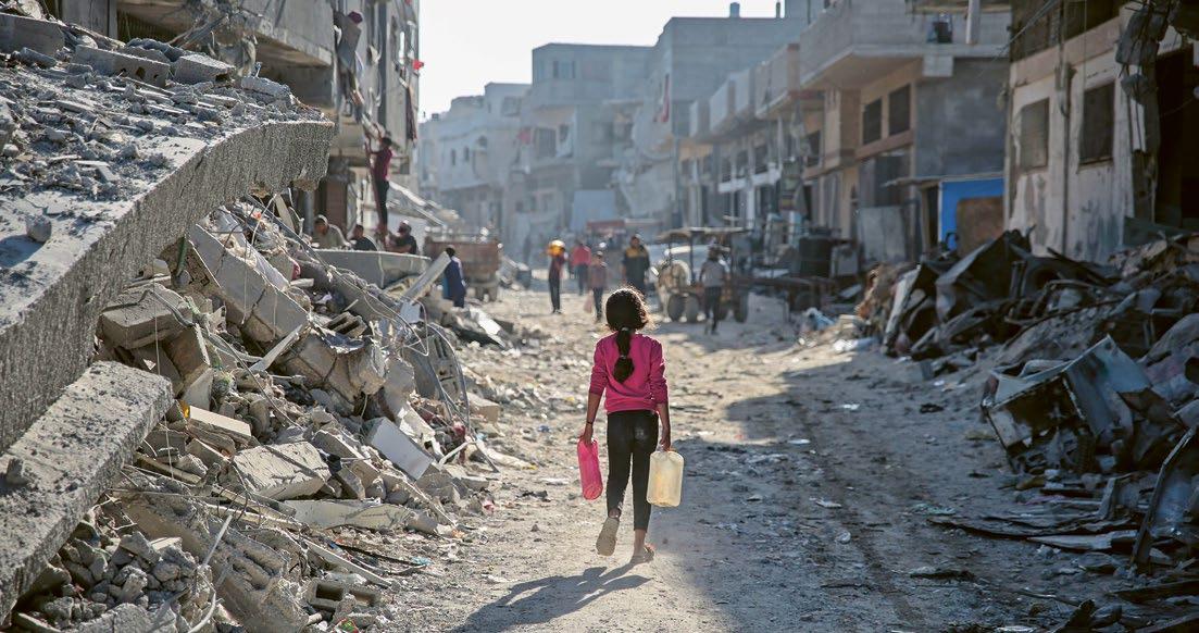 Jabalia, Gazastreifen: Ein Kind trägt Wasserkanister durch die Trümmer einer Wohngegend.