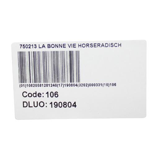 The GS1-128 label is an expanded, single-line barcode that allows multiple data elements to be encoded into one barcode. These labels must be placed on the outside of the case. Within the barcode, each data element is identified by a two-digit identifier shown in parentheses immediately before the information (e.g., (15)).
