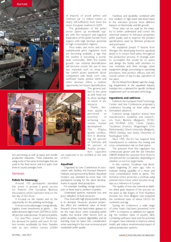 of import) of wood pellets and Germany (at 1.6 million tonnes or nearly self-sufficient) have been the major European markets in 2009. The globalization of the pellet sector opens up worldwide supply with the transport and logistical implication of the pellet transfer from regions with high biomass potential to high consumption regions. Price index and more and more sophisticated price regulation tools are becoming available, a sign that the market is becoming a worldwide commodity. With the market growth, raw material diversification will become crucial: the use of new raw materials such as straw and hay (which poses questions about competition with feed), corn cobs, sunflower husks, peanut shells and other biomass offers a realistic opportunity for future diversification. The general pattern is the same as with feed: not to allow spoilage or waste of any resource. Finally, biomass quality is perceived as essential in achieving successful market development. The ENplus quality certification is developing: 60 percent of Germany and 90 percent of Austria production capacities are expected to be certified at the end of 2011. Aquafeed Organised by Linx Conferences in association with Nofima, the Norwan Research Institute, and sponsored by Buhler, Aquafeed Horizon was attended by more than 100 participants looking for the latest developments in aquatic feed production. For example, handling, storage and transport of feeds lead to attrition of pellets. Undersized particles represent loss and poor utilisation of feed resources. Thus, feed with high physical pellet quality is in demand. However, physical properties affect the nutritional value of feeds. Research shows that feed intake appears to be the main factor when evaluating pellet quality, but several other factors such as pellet durability, nutrient digestibility and fat belching must be taken into consideration when searching for the most economical and sustainable pellet quality.