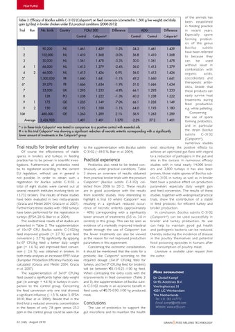 FEATURE of the animals has been established in feeding practice in recent years. Trial Run No. birds Country FCRc1500 Difference ADG Difference Especially spore Control Control Calsporin® Control Calsporin® forming probiotics of the genus Bacillus subtilis 1 90,200 NL 1.461 1.439 -1.5% 54.3 1.461 1.439 have been referred 2 102,000 NL 1.410 1.368 -3.0% 56.8 1.410 1.368 to because they can be used 3 50,000 NL 1.561 1.478 -5.3% 50.0 1.561 1.478 without issue in 4 1 66,000 NL 1.413 1.379 -2.4% 56.0 1.413 1.379 combination with 4 2 66,000 NL 1.413 1.426 0.9% 56.0 1.413 1.426 organic acids, coccidiostats and 5* 1,500,000 FR 1.660 1.641 -1.1% 49.2 1.660 1.641 therapeutic antibi6* 39,270 FR 1.666 1.634 -1.9% 51.0 1.666 1.634 otics, beside that 7 33,000 UK 1.295 1.233 -4.8% 66.1 1.295 1.233 these products can easily survive heat 8 128 PO 1.238 1.222 -1.3% 60.2 1.238 1.222 treatments during 9 1 175 GE 1.235 1.149 -7.0% 66.1 1.235 1.149 feed production 9 2 150 GE 1.193 1.180 -1.1% 64.0 1.193 1.180 e.g. while pelleting. Concerning 10# 480,000 GE 1.263 1.289 2.1% 56.9 1.263 1.289 the use of spore Average 2,426,923 1,401 1.401 1.370 -2.2% 57.2 1.401 forming probiotics, and in particular ® * = in these trials Calsporin was tested in comparison to a positive control with essential oils the strain Bacillus ® # = in this trial Calsporin was showing a significant reduction of necrotic enteritis corresponding with a significantly subtilis C-3102 lower amount of treatments in the Calsporin® group (Calsporin®), numerous studies Trial results for broiler and turkey to the supplementation with Bacillus subtilis exist describing the positive effects to achieve an optimized gut flora with regard Of course the effectiveness of viable C-3102 (- 69.0 %, Blair et al. 2004). to a reduction of pathogens in the gut and spores in broilers and turkeys in feeding also in the carcass. In numerous efficacy practice has to be proven in scientific inves- Practical experience tigations. Furthermore, all probiotics need Probiotics also need to be tested con- studies with in total nearly 14,000 broilbe to registered according to the current tinuously under practical conditions. Table ers and 2,000 turkeys it has also been EU legislation, without use in general is 3 shows an overview of results obtained proven, those viable spores of Bacillus subnot possible. In order to obtain such a from practical broiler trials with the product tilis C-3102 in turkey as well as in broiler registration for Bacillus subtilis C-3102, a Calsporin® (Bacillus subtilis C-3102) col- feed have a positive effect on production total of eight studies were carried out at lected from 2008 to 2012. These results parameters especially daily weight gain several research institutes involving tests on are in good accordance with the results and feed conversion. The results of these 13,732 broilers. The results of these studies from scientific studies. Very interesting to studies, together with widespread practical have been evaluated in two meta-analyses highlight is trial 10 where Calsporin® was trials, show the contribution of a stable (Gracia and Medel 2004, Gracia et al. 2007). resulting in a significant reduced occur- in feed probiotic for efficient turkey and Furthermore three studies with 1960 turkeys rence of necrotic enteritis (approximately broiler production. In conclusion, Bacillus subtilis C-3102 have been performed for the registration in - 40%) corresponding with a significantly turkeys (EFSA 2010, Blair et al. 2004). lower amount of treatments (0.5 vs. 3.0 in (Calsporin ®) can be used successfully in The zootechnical results of all studies are control) in this group. This can be seen as broiler and turkey production. Its use presented in Table 2. The supplementation evidence of a markedly improved intestinal can help to maintain good gut health of 10x108 CFU Bacillus subtilis C-3102/kg health through the use of Calsporin® but and pathogenic bacteria can be reduced, feed improved growth (+ 2.7 %) and feed the fewer treatments can also be viewed thereby reducing the incidence of disease conversion (- 2.7 %) significantly. By applying as the reason for not improved production in the poultry themselves and potential food poisoning episodes in humans after 5x108 CFU/kg feed a better daily weight parameters in this experiment. Concerning the economic consideration, the consumption of poultry meat. gain (+ 1.6 %) and improved feed converLiterature is available upon request from sion (- 2.6 %) was obtained in broilers. In it should be mentioned that the costs for a both meta-analyses an increased EPEF-Value probiotic like Calsporin® according to the the author. (European Production Efficiency Factor) was required dosage (3x108 CFU/kg feed for calculated (Gracia and Medel 2004, Gracia turkeys, and 5x108 CFU/kg feed for broilers) et al. 2007). will be between €0.15-0.25 /100 kg feed. More information: The supplementation of 3x108 CFU/kg When contrasting the extra costs with the feed caused a significantly higher daily weight improvements in feed conversion (Table 2 Dr Detlef Kampf gain (in average + 4.6 %) in turkeys in com- and 3), the supplementation of Bacillus subtiOrffa Additives B.V. parison to the control group. Concerning lis C-3102 results in an economic benefit in Vierlinghstraat 51 the feed conversion only one trial showed feed costs of €0.75-0.90 /100 kg produced 4251 LC Werkendam a significant influence (- 1.5 %, table 3, EFSA meat. The Netherlands Tel: +31 183 447771 2010; Blair et al. 2004). Beside that in the Email: kampf@orffa.com third trial a reduced ammonia concentration Conclusions Website: www.orffa.com in the faeces of only 7.8 ppm versus 25.2 The use of probiotics to support the ppm in the control group could be seen due gut microflora and to maintain the health Table 3: Efficacy of Bacillus subtilis C-3102 (Calsporin®) on feed conversion (corrected to 1,500 g live weight) and daily gain (g/day) in broiler chicken und