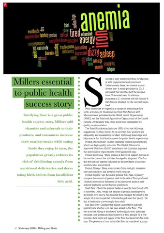 Millers essential to public health success story Fortifying flour is a great public health success story. Millers add vitamins and minerals to their products, and consumers increase their nutrient intake while eating foods they enjoy. In turn, the population greatly reduces its risk of debilitating anemia from nutritional deficiencies and devas tating birth defects from insufficient folic acid.