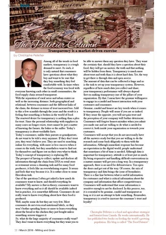 by Christophe Pelletier Among all of the trends in food markets, transparency is a tough demand to meet. As such, it is only natural that consumers have questions about what they buy and want to be sure that they buy something they feel comfortable with. In times when the food economy was local with everyone knowing each other in small communities, the food supply chain seemed transparent. With the separation of rural areas and urban centres as well as the increasing distance; both geographical and relational, between consumers and the different links of the chain, the distance in terms of trust increased too. Add to this a few scandals through the years and the result is a feeling that something is broken in the world of food. The renewed desire for transparency is nothing than a plea for trust. Since the personal relationship with suppliers in many cases no longer exists, trust cannot be just a matter of knowing the farmer, the baker or the miller. Today’s transparency is about verifiable facts. Today’s consumers, unlike their parents or grandparents, do not want to be told a story anymore. If they don’t trust you, they won’t believe you. They are used to searching online for everything, with more or less success when it comes to the truth, but they nonetheless want to find out for themselves and figure out on their own what to think. Today’s concept of transparency is replacing PR. The prospect of having to collect, update and disclose all information through the chain from DNA to retail store or restaurant seems a daunting task and for many food producers, it feels like an overwhelming request. It seems and feels that way because it is. It is rather close to some Herculean task. One of the questions I often get asked is how much do consumers want to know, and should everything be available? My answer is that in theory, consumers want to know everything and so it all should be available indeed but in practice, it is somewhat different. Consumers do not really want to know everything about how their food is produced. Well, maybe some do but they are very few. Most consumers do not even read nutritional labels, so they won’t bother spending hours or more to learn everything about the bread or the chicken they just bought unless something serious triggers it. So, what do the large majority of consumers really want? They don’t want to know everything but they want you to 20 | March 2016 - Milling and Grain